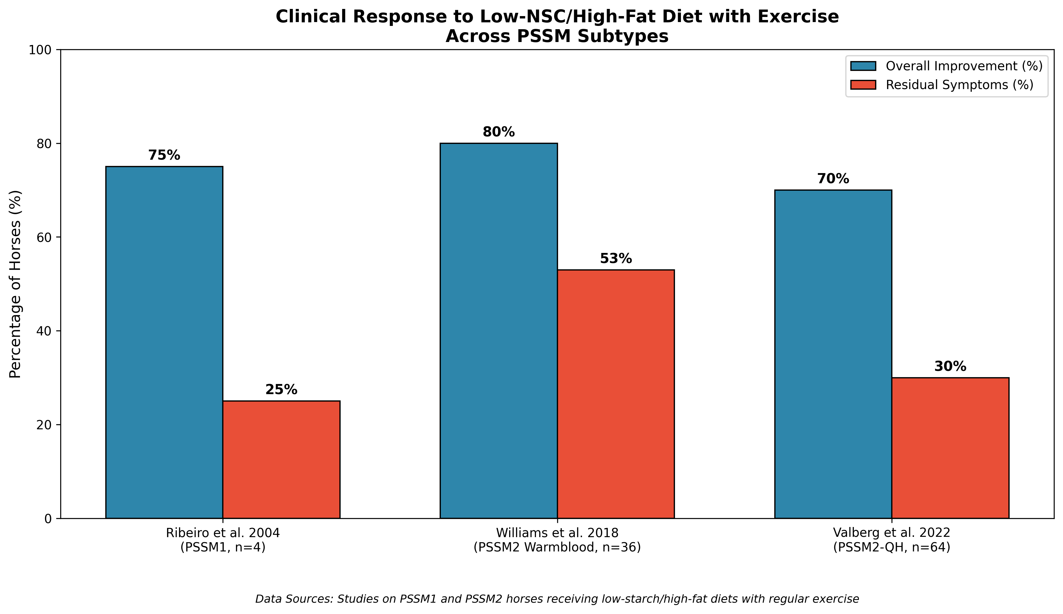 Figure 2. Clinical response to low-NSC/high-fat dietary management with exercise across PSSM subtypes. Overall improvement was reported in the majority of cases across subtypes; however, residual symptoms persisted in a substantial proportion of horses, particularly in PSSM2 Warmblood horses. Data derived from Williams et al. 2018 [8], Valberg et al. 2022 [9], and Ribeiro et al. 2004 [6].
