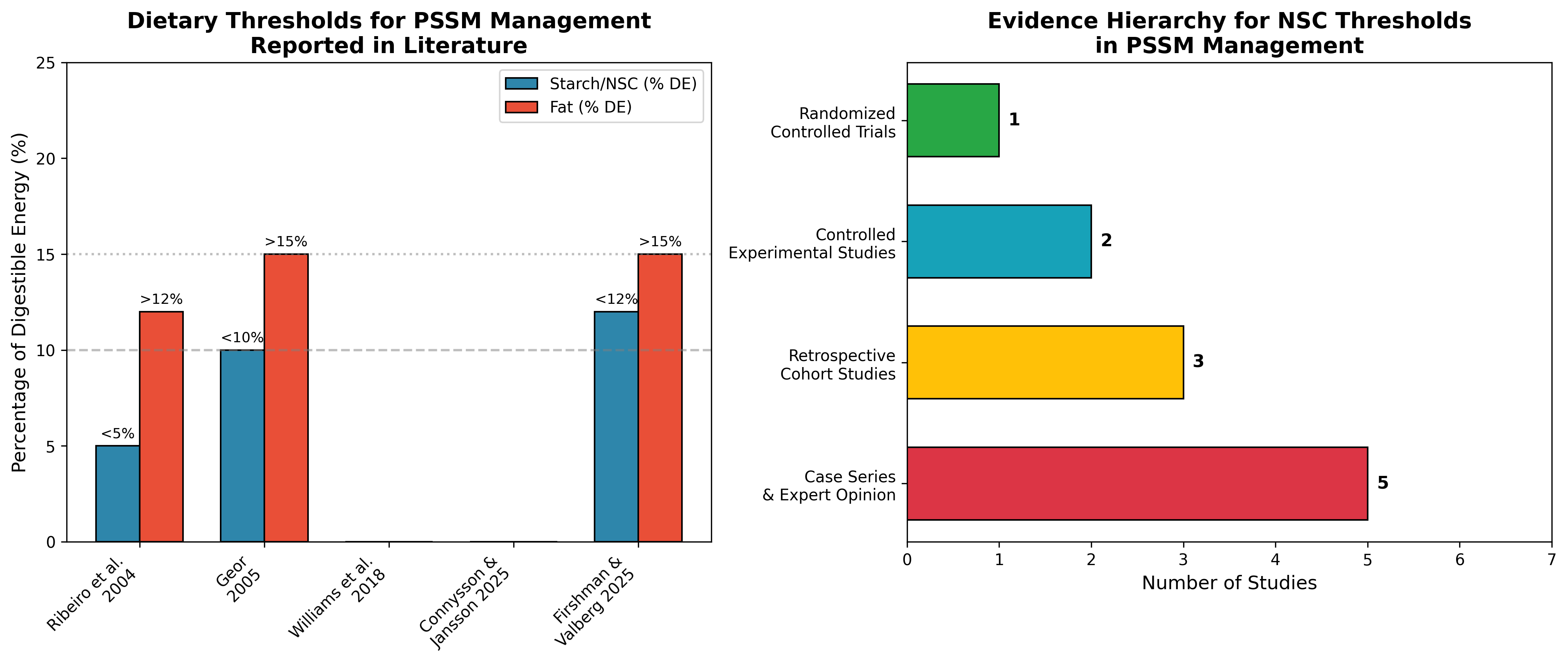 Figure 1. Left panel: Reported starch/NSC and fat thresholds from key studies examining PSSM dietary management. Right panel: Distribution of studies by evidence hierarchy, demonstrating the predominance of observational and consensus-based evidence relative to controlled experimental trials. Data sources: Ribeiro et al. 2004 [6], Geor 2005 [3], Firshman & Valberg 2025 [1].