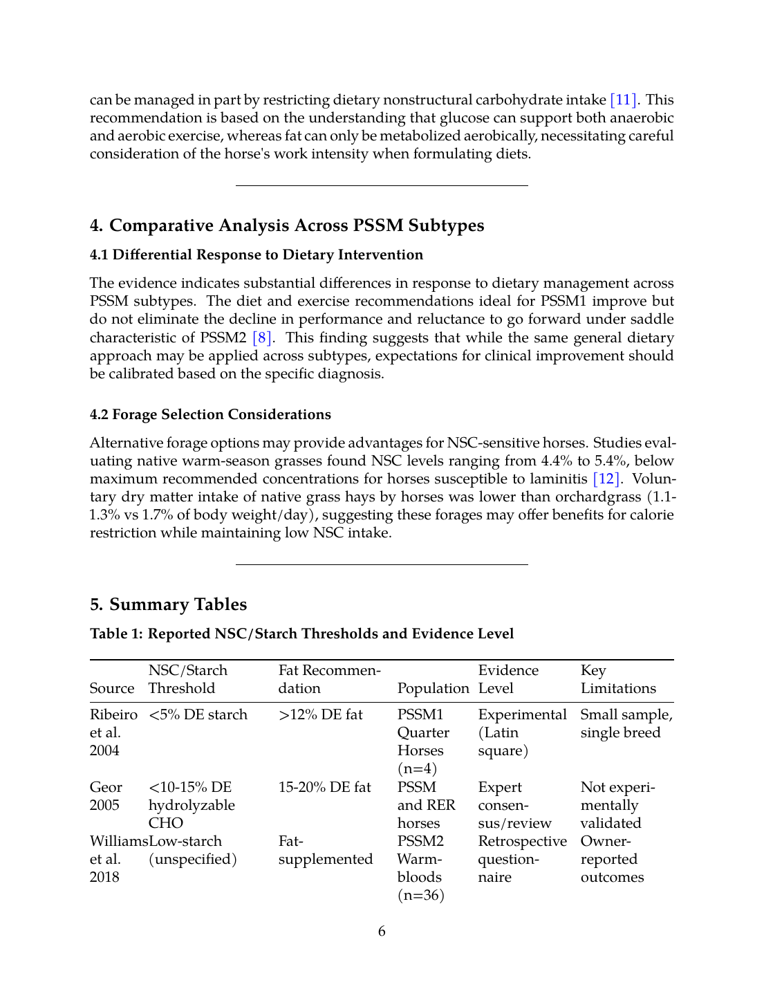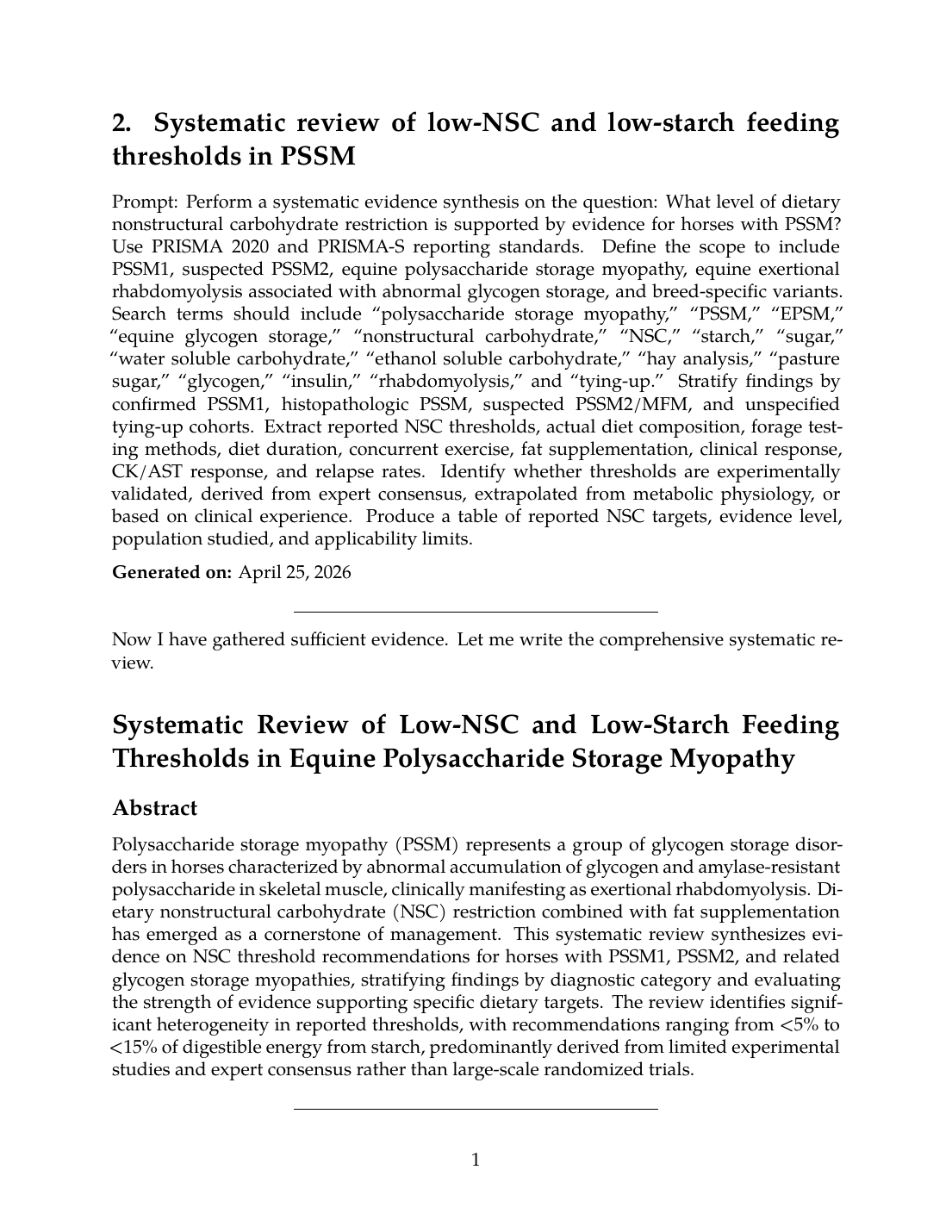 This systematic review argues that the long-circulated "below ten percent NSC" rule for PSSM forage is a severity-tiered range, not a single number, with appropriate ceilings shifting by diagnostic certainty, workload, and concurrent fat supplementation, not only because reported clinical thresholds in the literature span less than five to less than fifteen percent of digestible energy from starch with no agreed cut point, but also because the dose-response data behind each tier come from heterogeneous populations and inconsistent forage-testing protocols; by stratifying PRISMA-eligible evidence across PSSM1, biopsy-confirmed PSSM, suspected PSSM2 and MFM, and unspecified tying-up cohorts, this review establishes defensible NSC ceilings for owner and veterinarian use and shows which numbers reflect trial data and which reflect expert consensus.