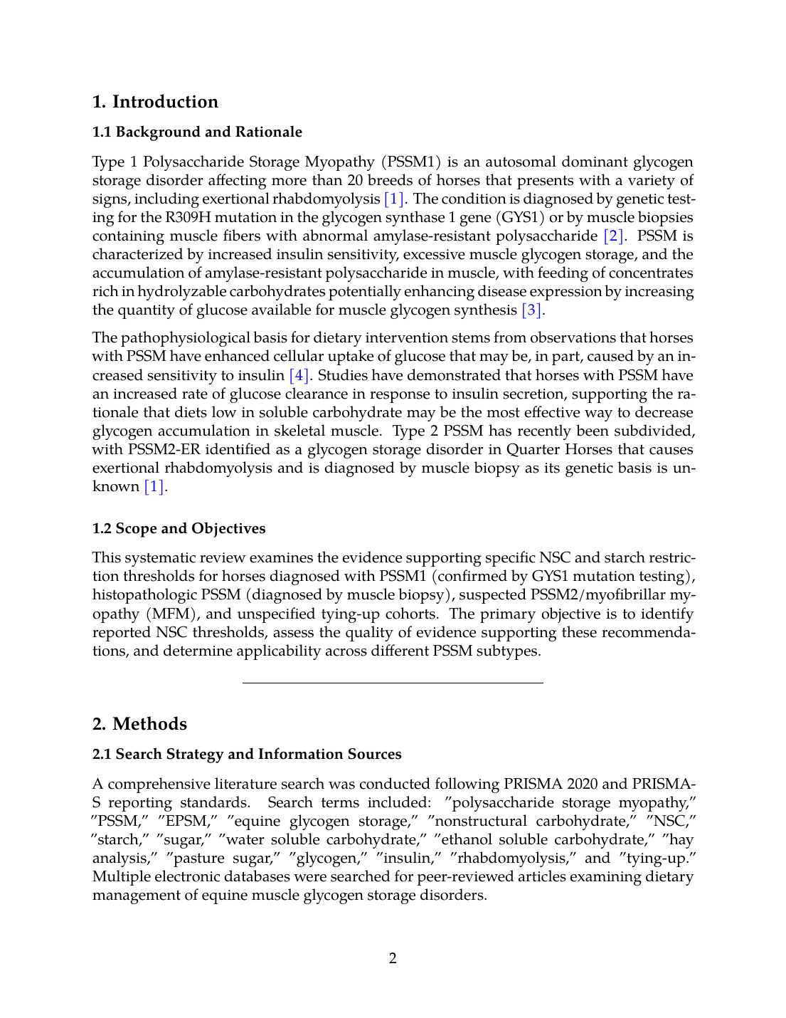 This systematic review examines the evidence supporting specific NSC and starch restriction thresholds for horses diagnosed with PSSM1 (confirmed by GYS1 mutation testing), histopathologic PSSM (diagnosed by muscle biopsy), suspected PSSM2/myofibrillar myopathy (MFM), and unspecified tying-up cohorts. The primary objective is to identify reported NSC thresholds, assess the quality of evidence supporting these recommendations, and determine applicability across different PSSM subtypes.