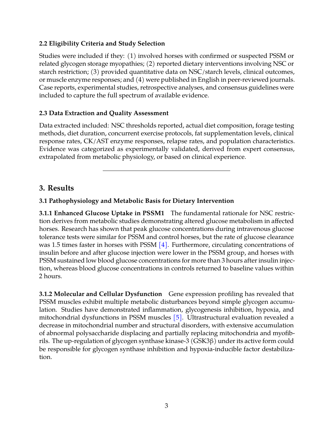 Studies were included if they: (1) involved horses with confirmed or suspected PSSM or related glycogen storage myopathies; (2) reported dietary interventions involving NSC or starch restriction; (3) provided quantitative data on NSC/starch levels, clinical outcomes, or muscle enzyme responses; and (4) were published in English in peer-reviewed journals. Case reports, experimental studies, retrospective analyses, and consensus guidelines were included to capture the full spectrum of available evidence.