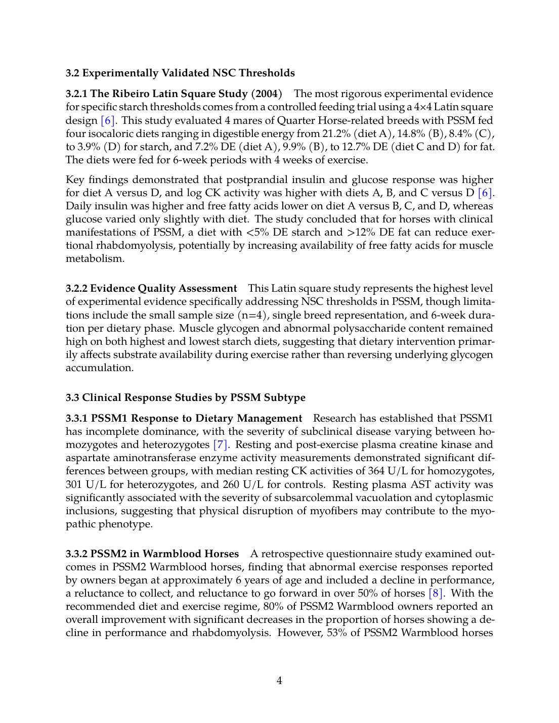 This Latin square study represents the highest level of experimental evidence specifically addressing NSC thresholds in PSSM, though limitations include the small sample size (n=4), single breed representation, and 6-week duration per dietary phase. Muscle glycogen and abnormal polysaccharide content remained high on both highest and lowest starch diets, suggesting that dietary intervention primarily affects substrate availability during exercise rather than reversing underlying glycogen accumulation.