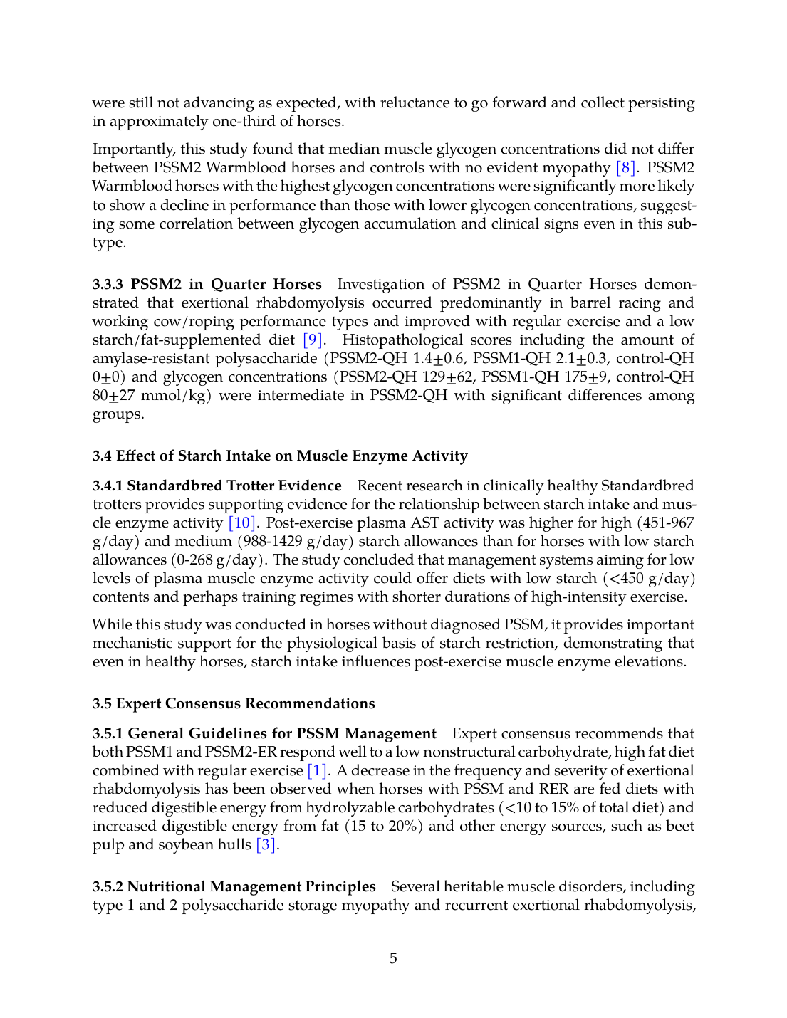 Dietary intervention alone is insufficient for optimal management of PSSM. Both PSSM1 and PSSM2-ER respond well to a low nonstructural carbohydrate, high fat diet combined with regular exercise [1]. The importance of this combined approach was highlighted in the PSSM2 Warmblood study, where despite dietary modification, 53% of horses were still not advancing as expected [8]. The interaction between exercise training and dietary management requires further investigation to optimize protocols.