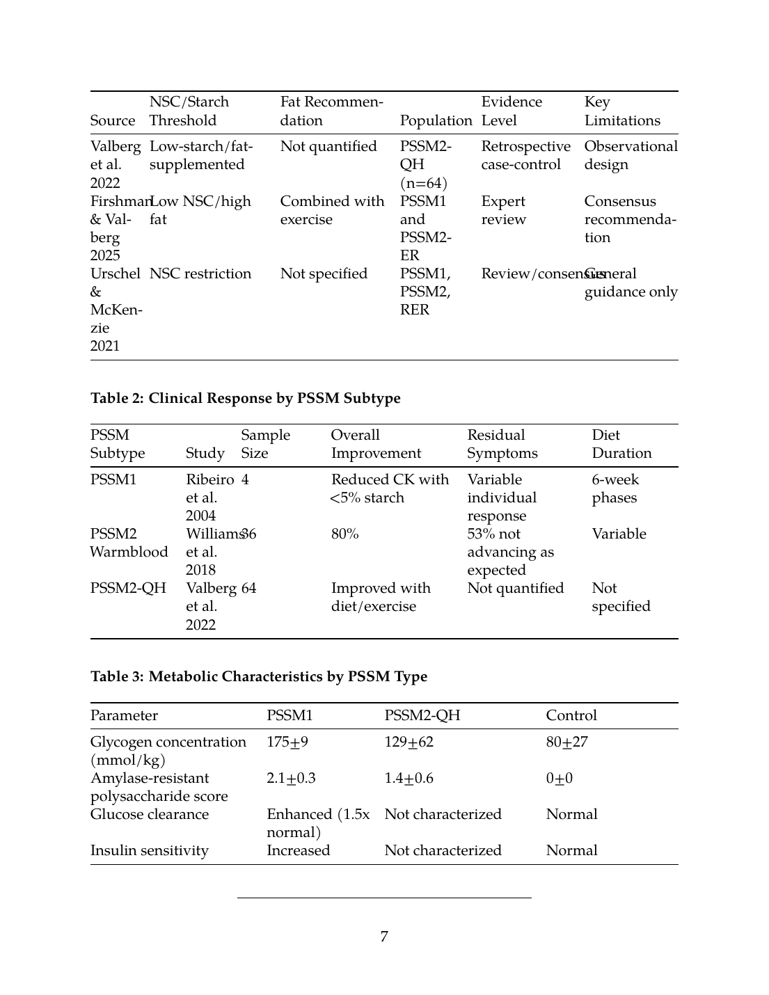 | Urschel & McKenzie 2021 | NSC restriction | Not specified | PSSM1, PSSM2, RER | Review/consensus | General guidance only |