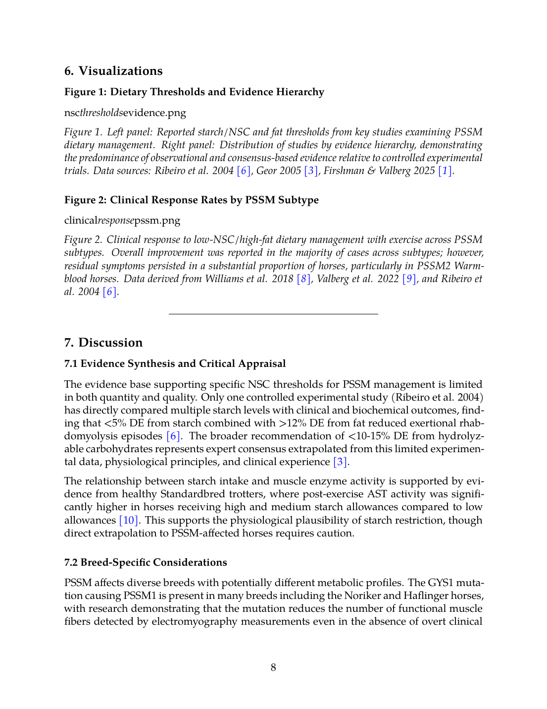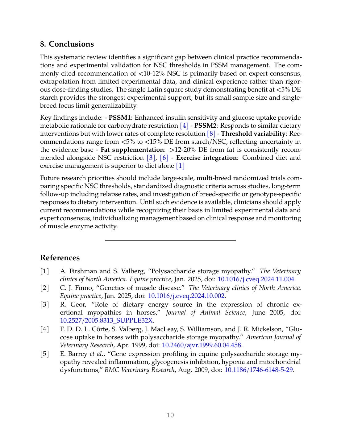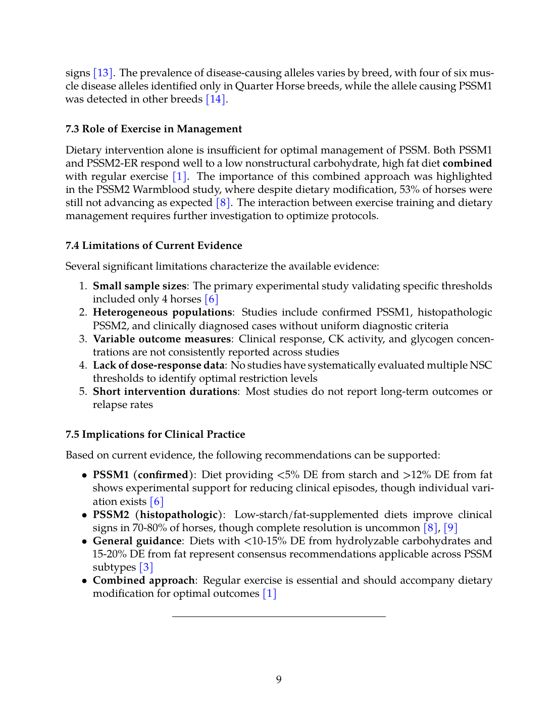 Future research priorities should include large-scale, multi-breed randomized trials comparing specific NSC thresholds, standardized diagnostic criteria across studies, long-term follow-up including relapse rates, and investigation of breed-specific or genotype-specific responses to dietary intervention. Until such evidence is available, clinicians should apply current recommendations while recognizing their basis in limited experimental data and expert consensus, individualizing management based on clinical response and monitoring of muscle enzyme activity.