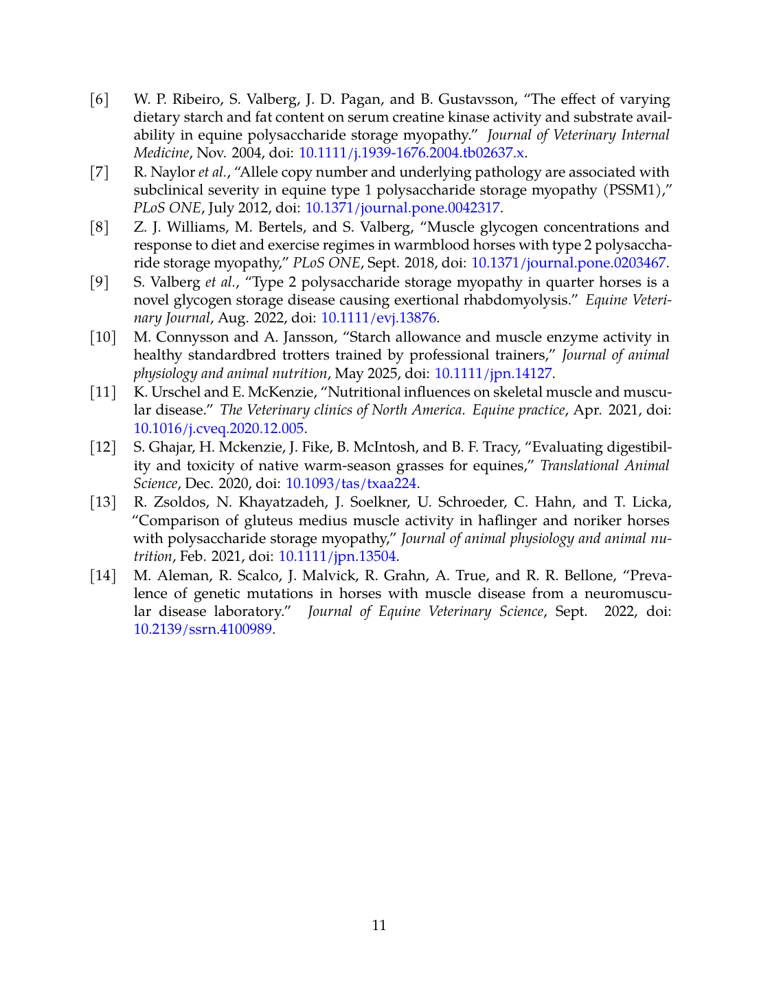 - W. P. Ribeiro, S. Valberg, J. D. Pagan, and B. Gustavsson, “The effect of varying dietary starch and fat content on serum creatine kinase activity and substrate availability in equine polysaccharide storage myopathy.,” Journal of Veterinary Internal Medicine, Nov. 2004. doi: 10.1111/j.1939-1676.2004.tb02637.x. View source