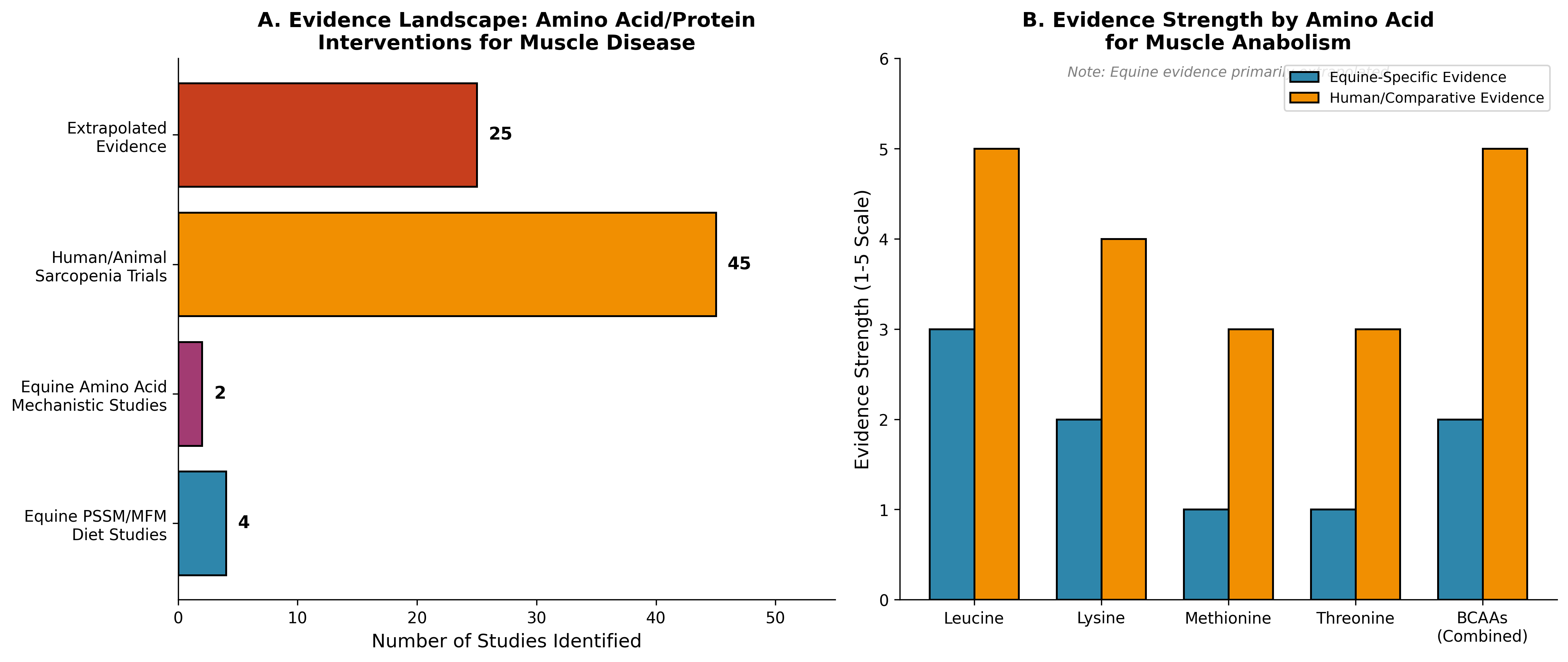 Figure 1. Evidence landscape for amino acid and protein interventions in muscle disease. Panel A shows the distribution of identified studies across evidence categories, highlighting the limited direct equine PSSM/MFM evidence compared to extrapolated human and comparative data. Panel B illustrates evidence strength by amino acid for muscle anabolism, comparing equine-specific to human/comparative evidence (Data sources: Literature search findings from [7],[10],[12],[11],[1],[2]).