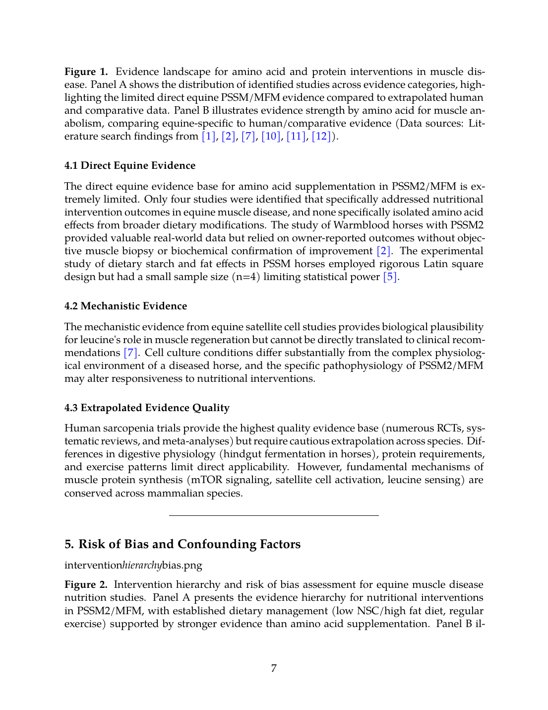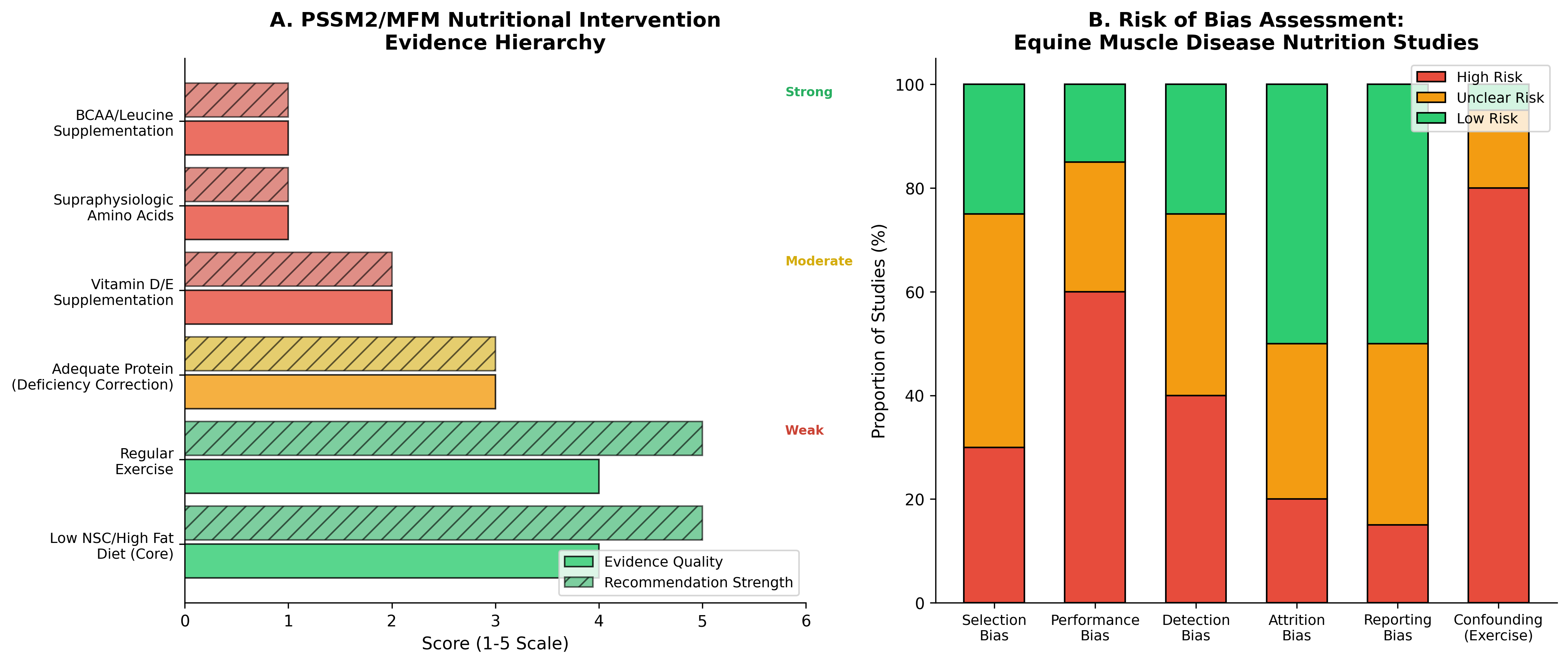 Figure 2. Intervention hierarchy and risk of bias assessment for equine muscle disease nutrition studies. Panel A presents the evidence hierarchy for nutritional interventions in PSSM2/MFM, with established dietary management (low NSC/high fat diet, regular exercise) supported by stronger evidence than amino acid supplementation. Panel B illustrates assessed risk of bias domains across available equine studies (Data synthesized from [2],[5],[8],[10]).