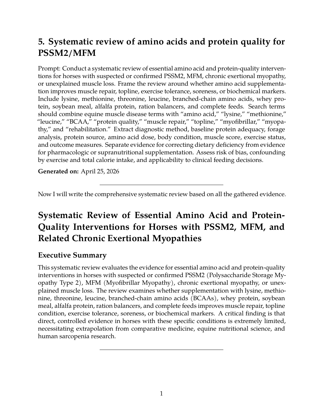 This systematic review reveals that direct evidence for essential amino acid and protein-quality interventions specifically in horses with PSSM2, MFM, or related chronic exertional myopathies is extremely limited to non-existent. The current evidence base supports: