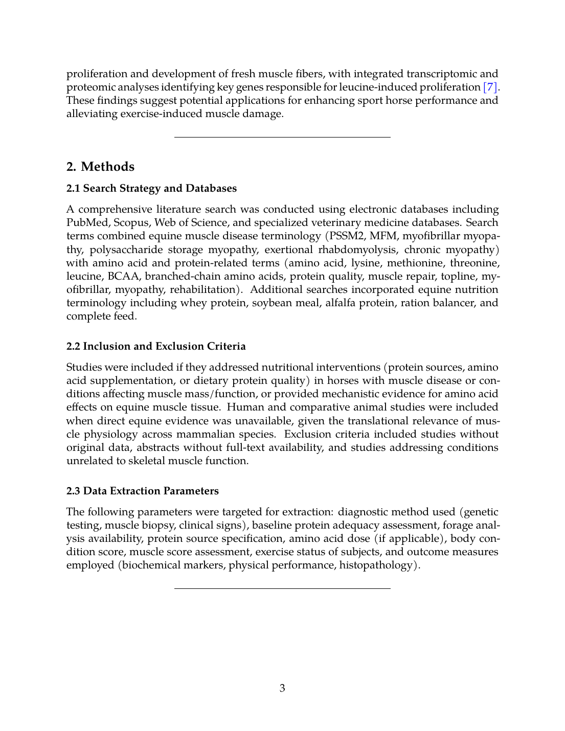 A comprehensive literature search was conducted using electronic databases including PubMed, Scopus, Web of Science, and specialized veterinary medicine databases. Search terms combined equine muscle disease terminology (PSSM2, MFM, myofibrillar myopathy, polysaccharide storage myopathy, exertional rhabdomyolysis, chronic myopathy) with amino acid and protein-related terms (amino acid, lysine, methionine, threonine, leucine, BCAA, branched-chain amino acids, protein quality, muscle repair, topline, myofibrillar, myopathy, rehabilitation). Additional searches incorporated equine nutrition terminology including whey protein, soybean meal, alfalfa protein, ration balancer, and complete feed.