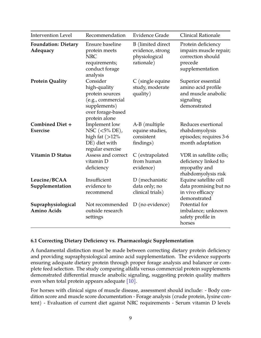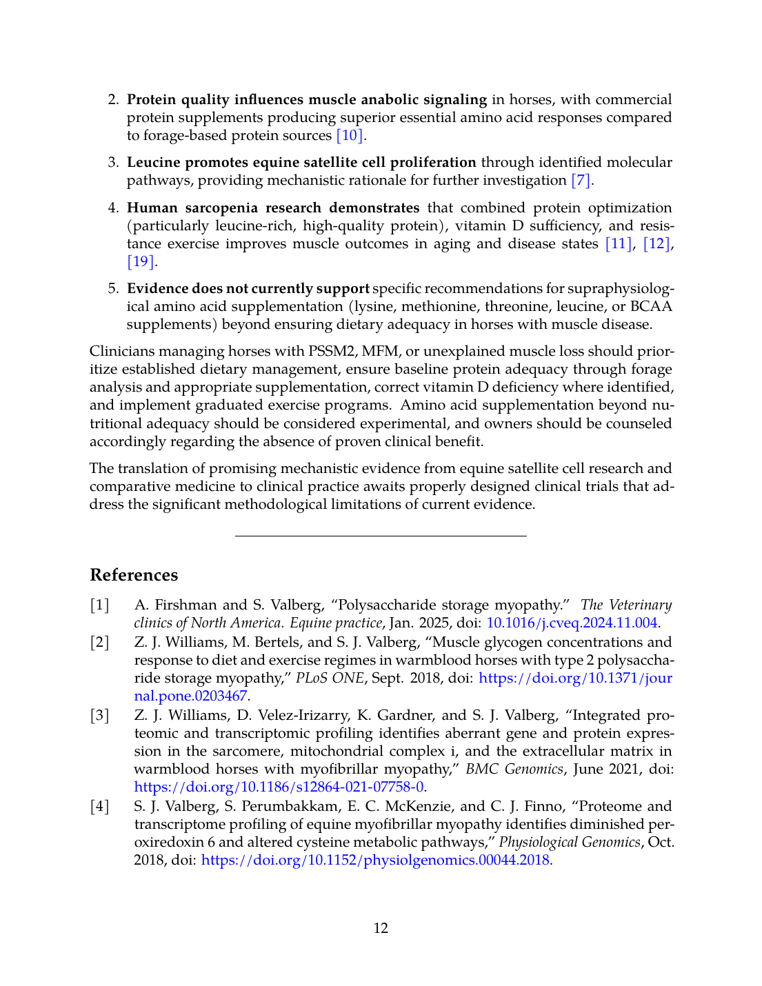 Clinicians managing horses with PSSM2, MFM, or unexplained muscle loss should prioritize established dietary management, ensure baseline protein adequacy through forage analysis and appropriate supplementation, correct vitamin D deficiency where identified, and implement graduated exercise programs. Amino acid supplementation beyond nutritional adequacy should be considered experimental, and owners should be counseled accordingly regarding the absence of proven clinical benefit.