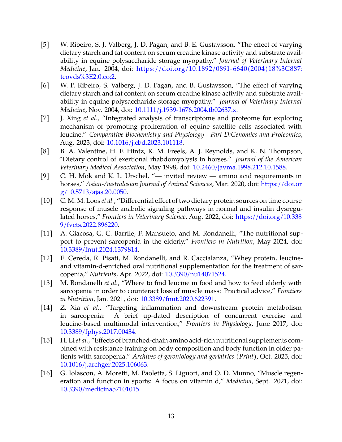 - W. P. Ribeiro, S. Valberg, J. D. Pagan, and B. Gustavsson, “The effect of varying dietary starch and fat content on serum creatine kinase activity and substrate availability in equine polysaccharide storage myopathy.,” Journal of Veterinary Internal Medicine, Nov. 2004. doi: 10.1111/j.1939-1676.2004.tb02637.x. View source