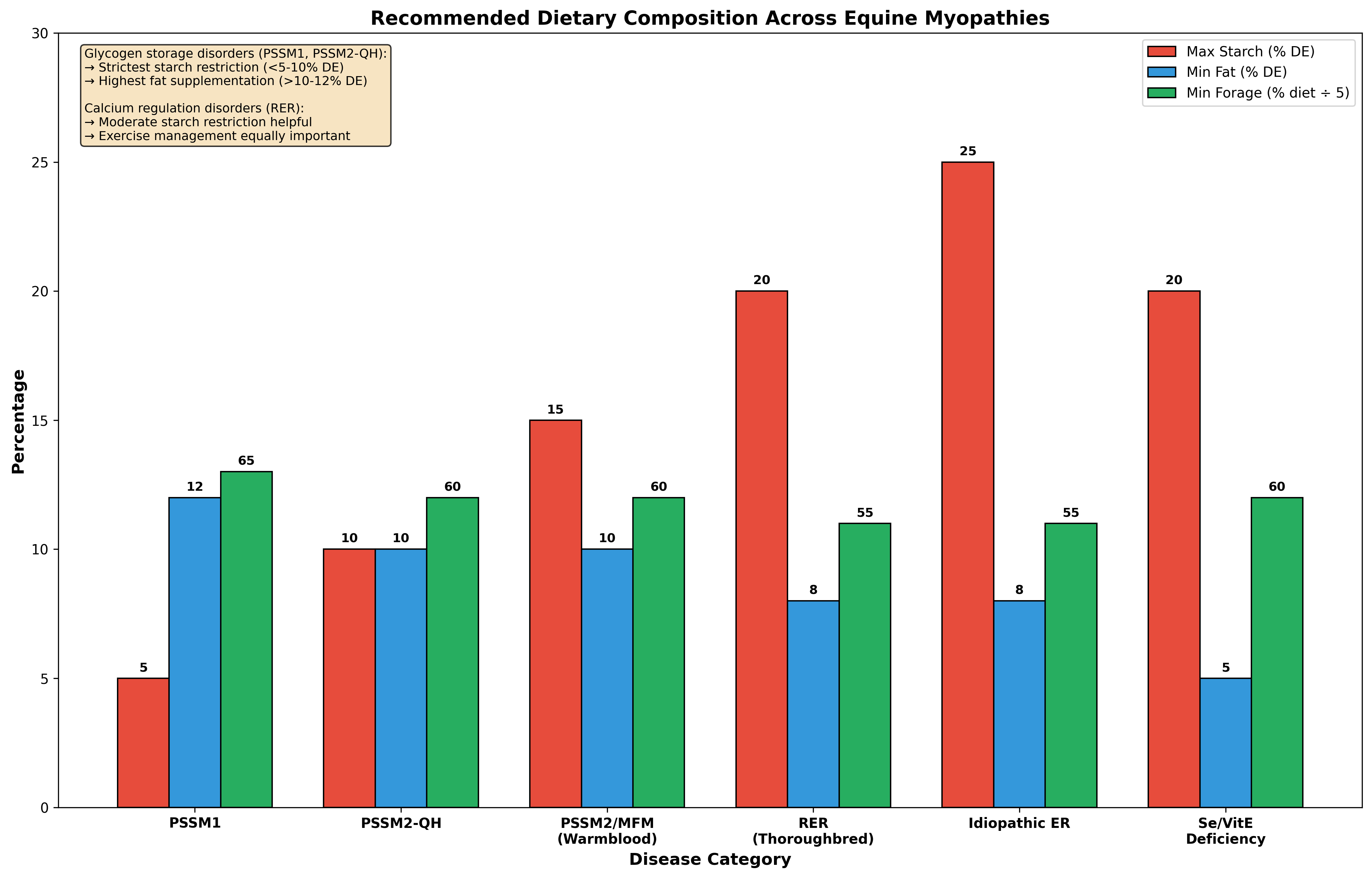 Figure 2. Recommended dietary composition across equine myopathies. Glycogen storage disorders require strictest starch restriction (<5-10% DE) and highest fat supplementation (>10-12% DE). Data derived from Ribeiro et al. and Valberg et al.