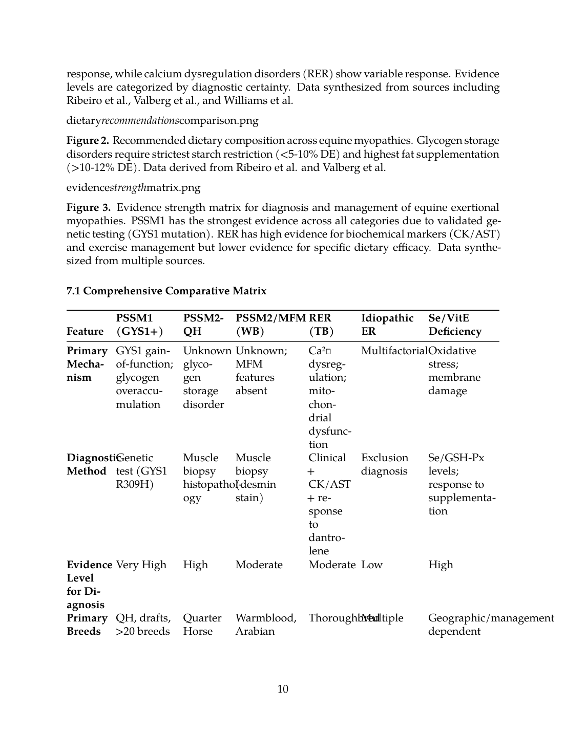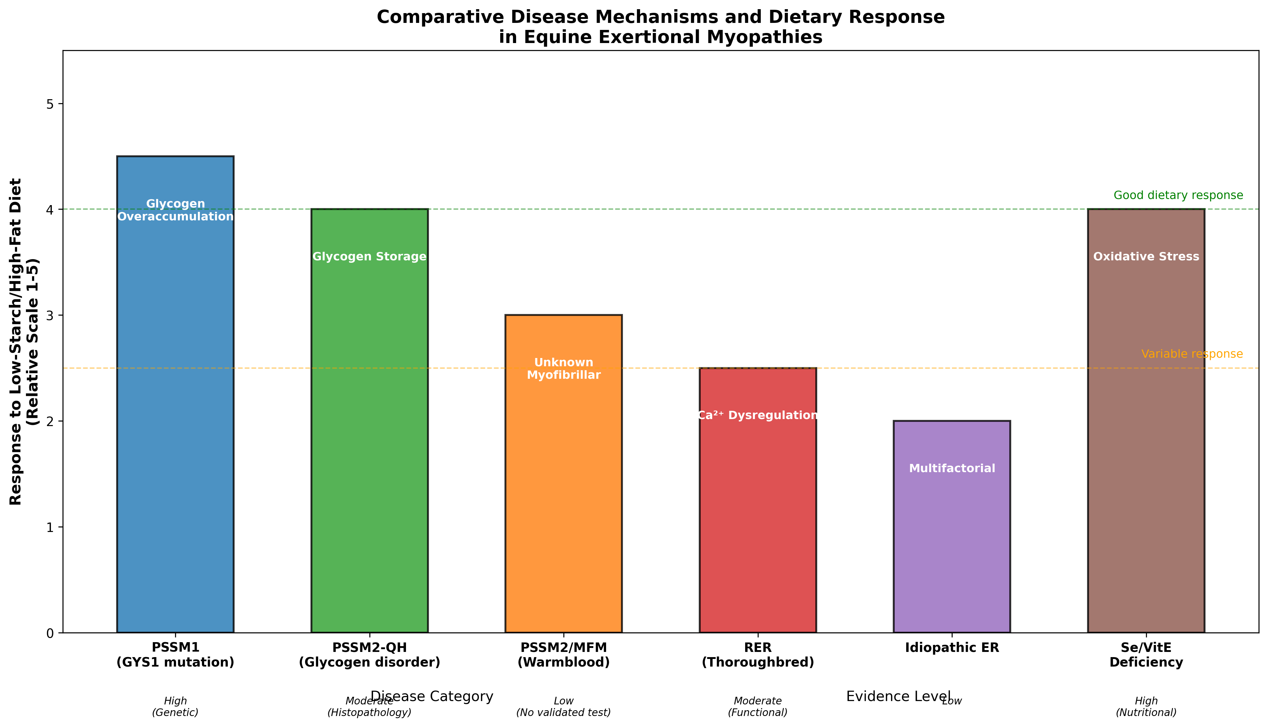 Figure 1. Comparative disease mechanisms and dietary response across equine exertional myopathies. Glycogen storage disorders (PSSM1, PSSM2-QH) show the strongest dietary response, while calcium dysregulation disorders (RER) show variable response. Evidence levels are categorized by diagnostic certainty. Data synthesized from sources including Ribeiro et al., Valberg et al., and Williams et al.