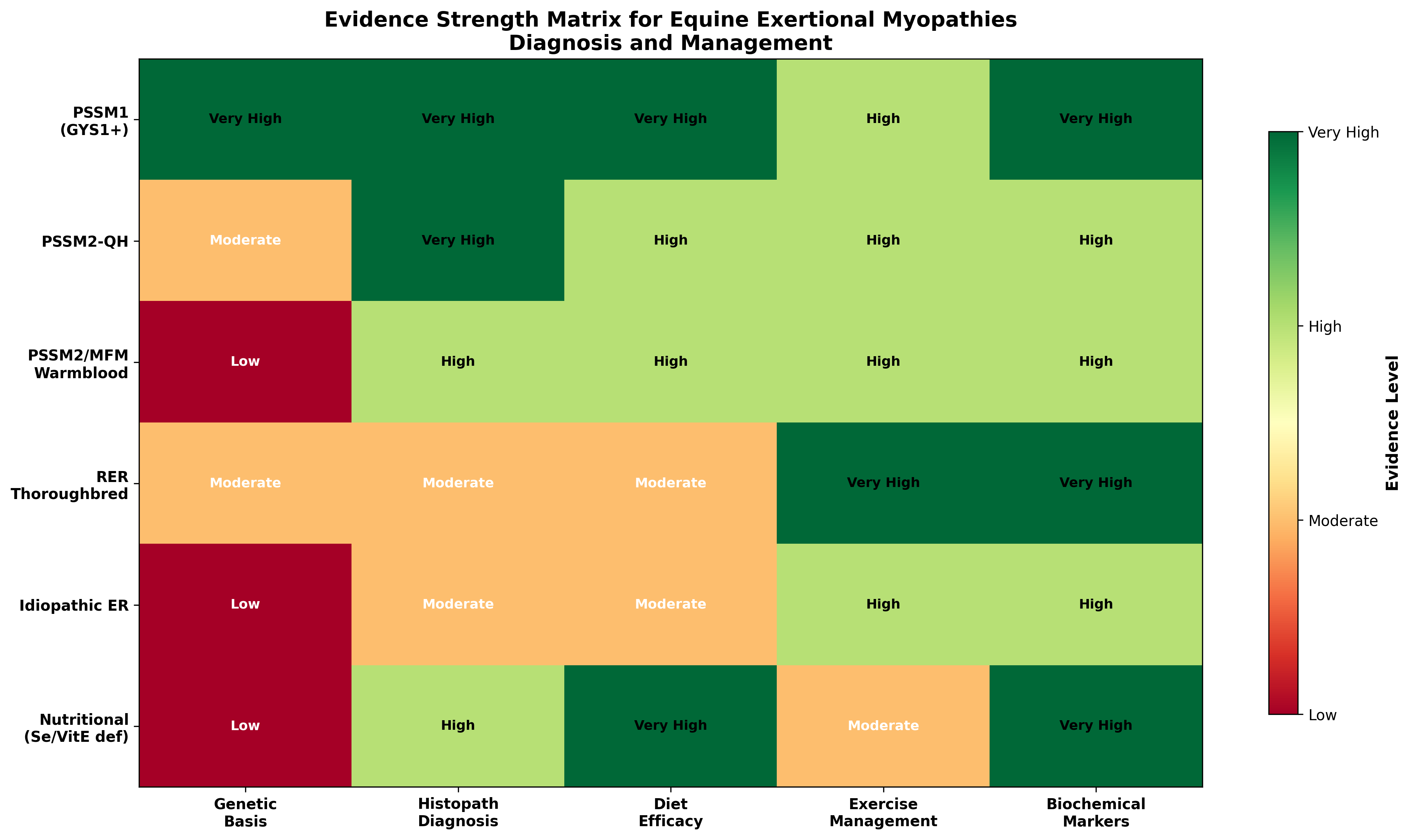 Figure 3. Evidence strength matrix for diagnosis and management of equine exertional myopathies. PSSM1 has the strongest evidence across all categories due to validated genetic testing (GYS1 mutation). RER has high evidence for biochemical markers (CK/AST) and exercise management but lower evidence for specific dietary efficacy. Data synthesized from multiple sources.