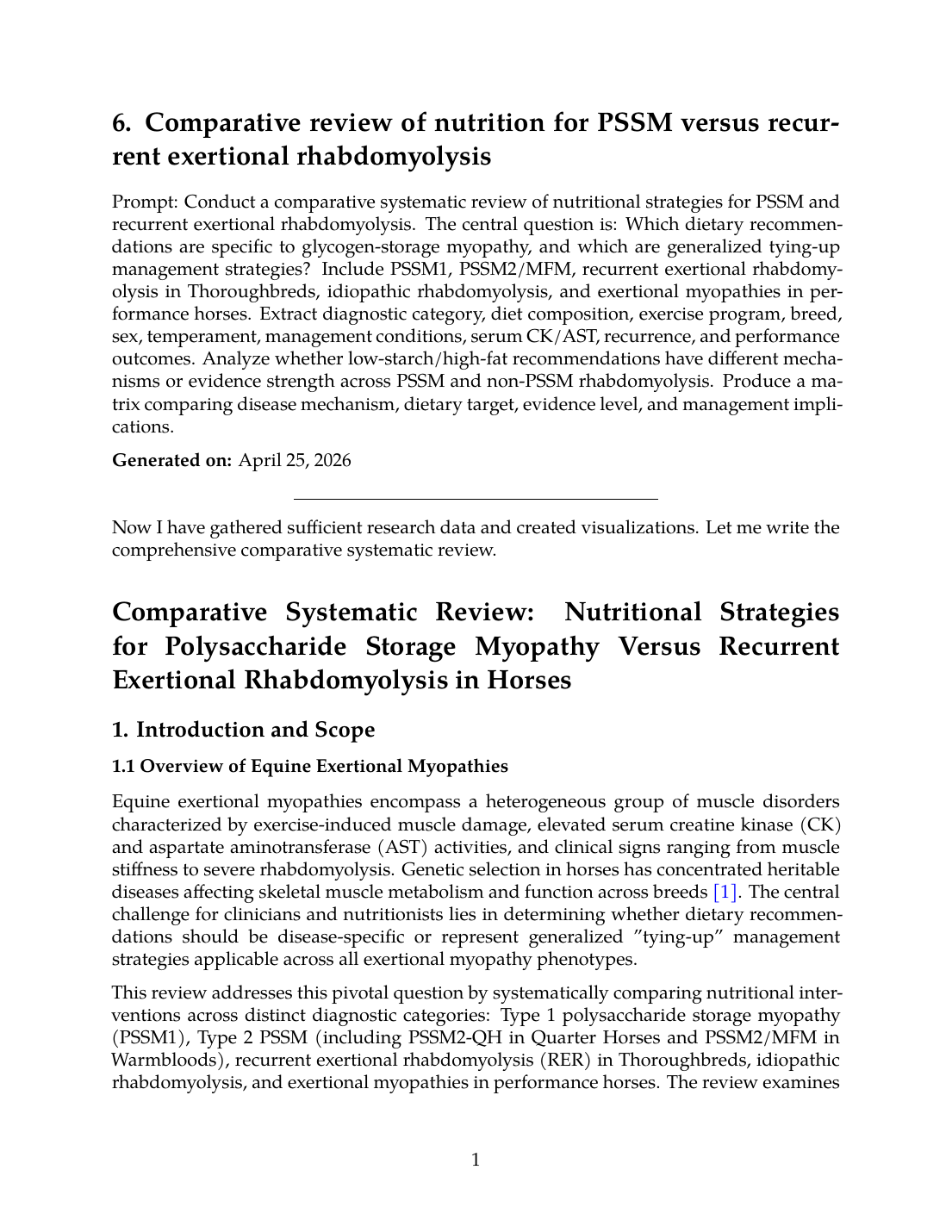 This systematic review aims to: (1) extract and compare diagnostic categories, diet composition, exercise programs, breed predispositions, sex effects, temperament associations, management conditions, serum biomarkers, recurrence rates, and performance outcomes across myopathy types; (2) analyze whether low-starch/high-fat recommendations have different mechanisms or evidence strength across PSSM and non-PSSM rhabdomyolysis; and (3) produce a comparative matrix of disease mechanism, dietary target, evidence level, and management implications.