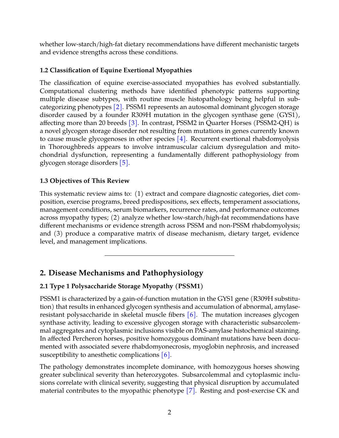 The classification of equine exercise-associated myopathies has evolved substantially. Computational clustering methods have identified phenotypic patterns supporting multiple disease subtypes, with routine muscle histopathology being helpful in sub-categorizing phenotypes [2]. PSSM1 represents an autosomal dominant glycogen storage disorder caused by a founder R309H mutation in the glycogen synthase gene (GYS1), affecting more than 20 breeds [3]. In contrast, PSSM2 in Quarter Horses (PSSM2-QH) is a novel glycogen storage disorder not resulting from mutations in genes currently known to cause muscle glycogenoses in other species [4]. Recurrent exertional rhabdomyolysis in Thoroughbreds appears to involve intramuscular calcium dysregulation and mitochondrial dysfunction, representing a fundamentally different pathophysiology from glycogen storage disorders [5].