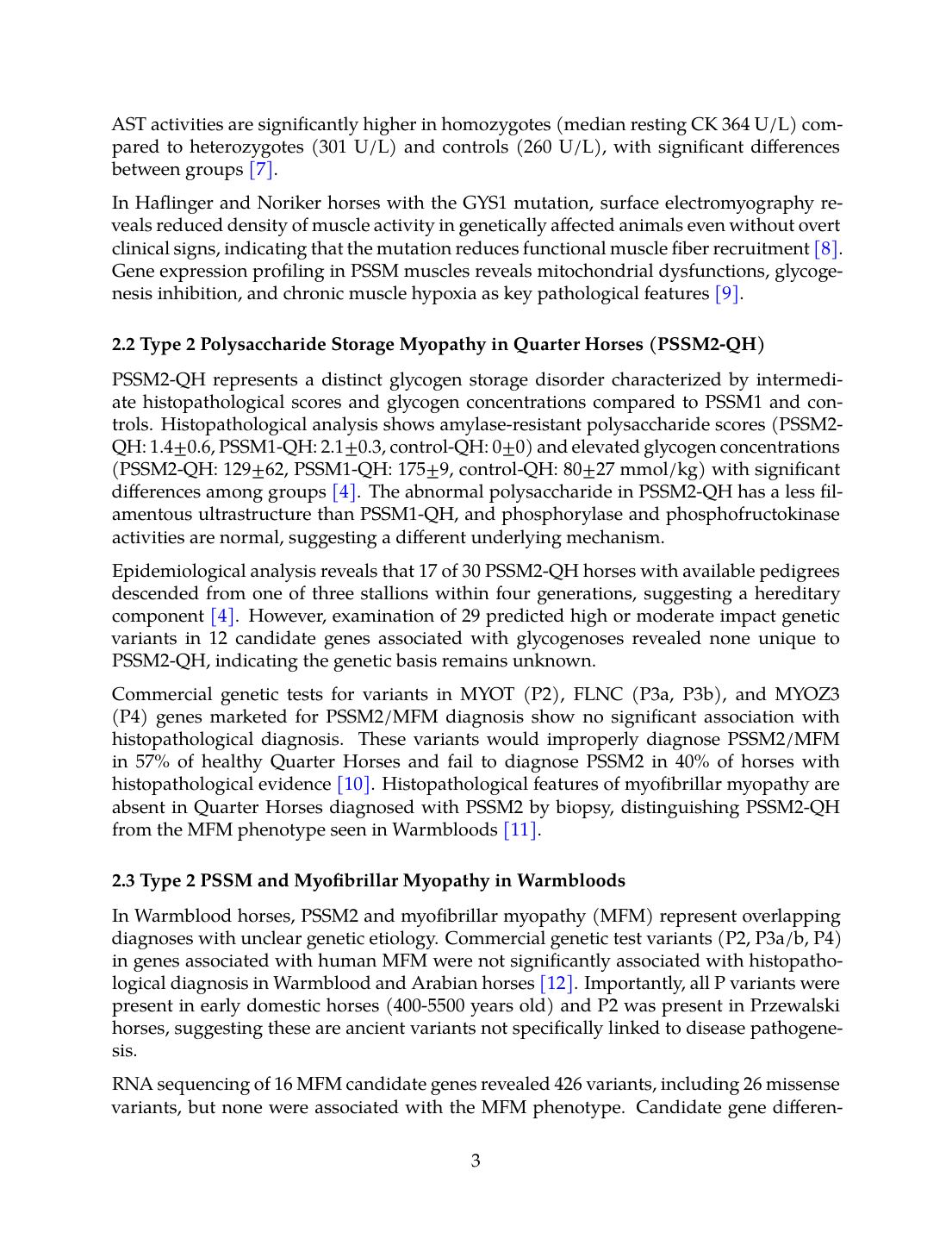 In Warmblood horses, PSSM2 and myofibrillar myopathy (MFM) represent overlapping diagnoses with unclear genetic etiology. Commercial genetic test variants (P2, P3a/b, P4) in genes associated with human MFM were not significantly associated with histopathological diagnosis in Warmblood and Arabian horses [12]. Importantly, all P variants were present in early domestic horses (400-5500 years old) and P2 was present in Przewalski horses, suggesting these are ancient variants not specifically linked to disease pathogenesis.