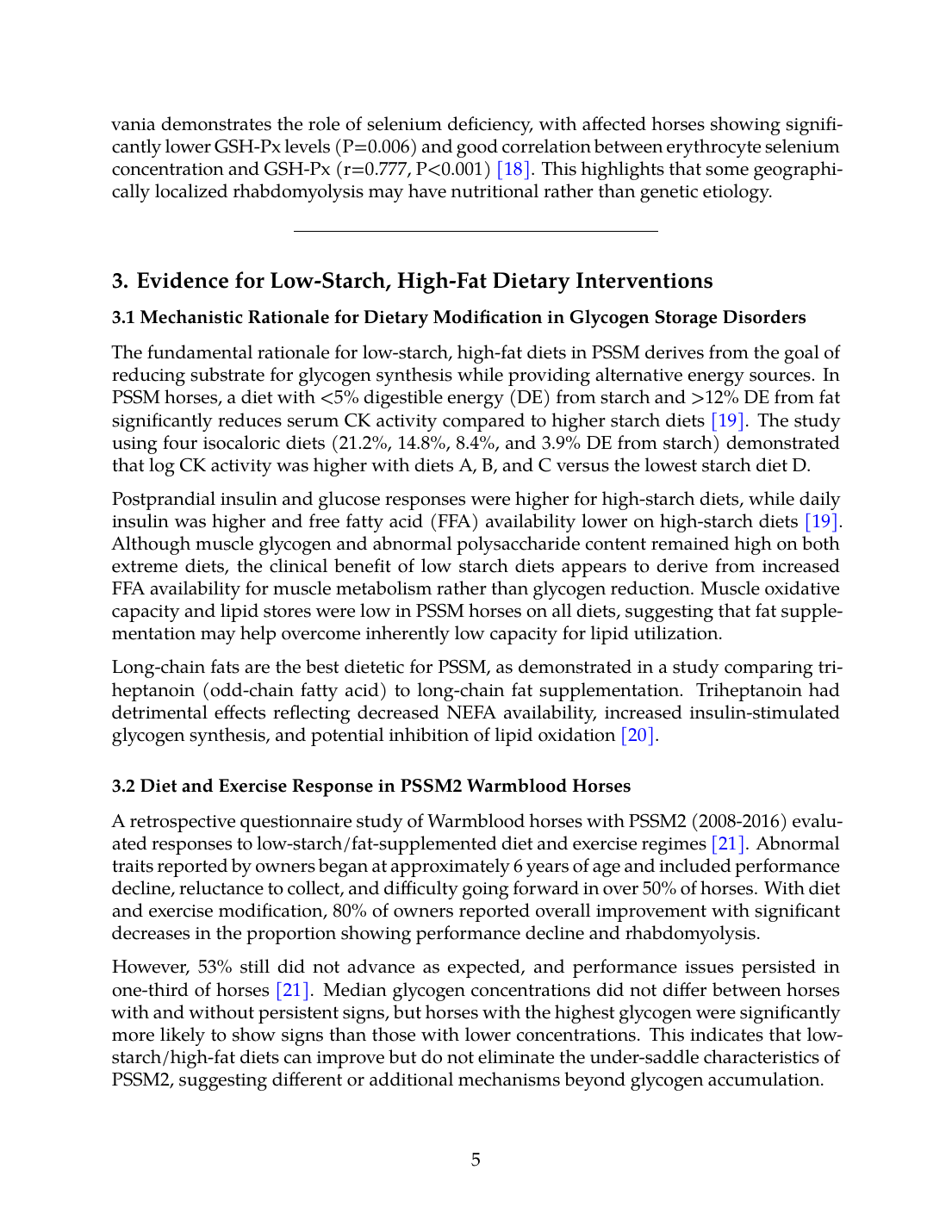 Early case series established that feeding a low-carbohydrate, high-fat diet decreased severity of exercise-induced muscle injury in horses with exertional rhabdomyolysis [24]. All 19 horses had evidence of chronic myopathic changes and abnormal glycogen accumulation; 11 also had complex polysaccharide accumulation. After 3-6 months on low-starch/high-fat diet, 16 horses had no episodes of rhabdomyolysis, with postexercise CK significantly lower than initial values. This study predates the genetic distinction between PSSM and RER, so the mixed population may explain the generally favorable response.