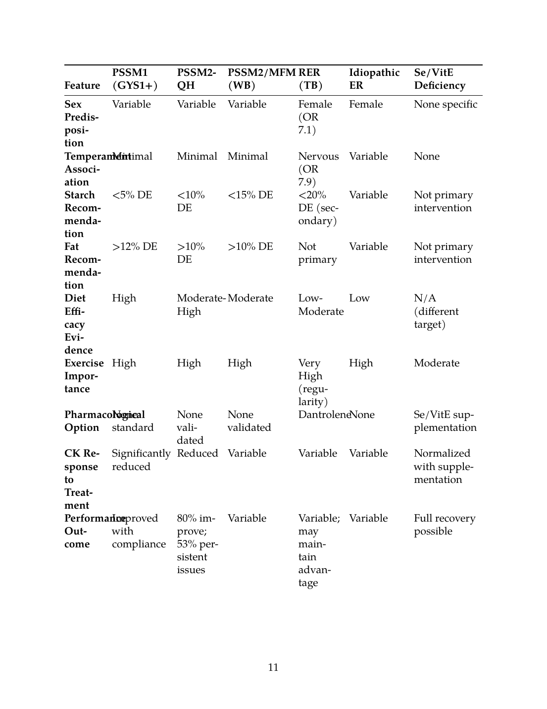 FeaturePSSM1 (GYS1+)PSSM2-QHPSSM2/MFM (WB)RER (TB)Idiopathic ERSe/VitE Deficiency
