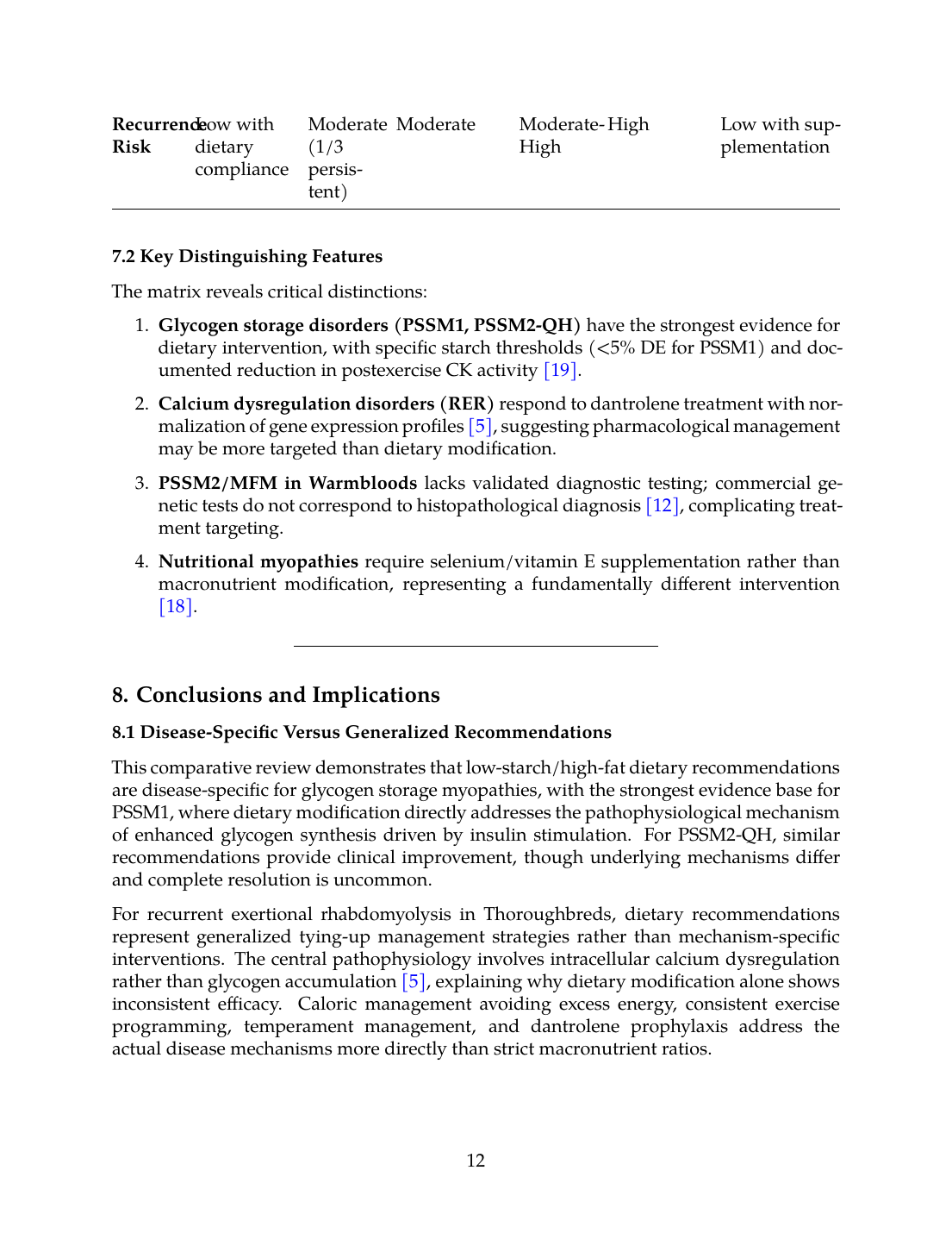 1. Glycogen storage disorders (PSSM1, PSSM2-QH) have the strongest evidence for dietary intervention, with specific starch thresholds (<5% DE for PSSM1) and documented reduction in postexercise CK activity [19].