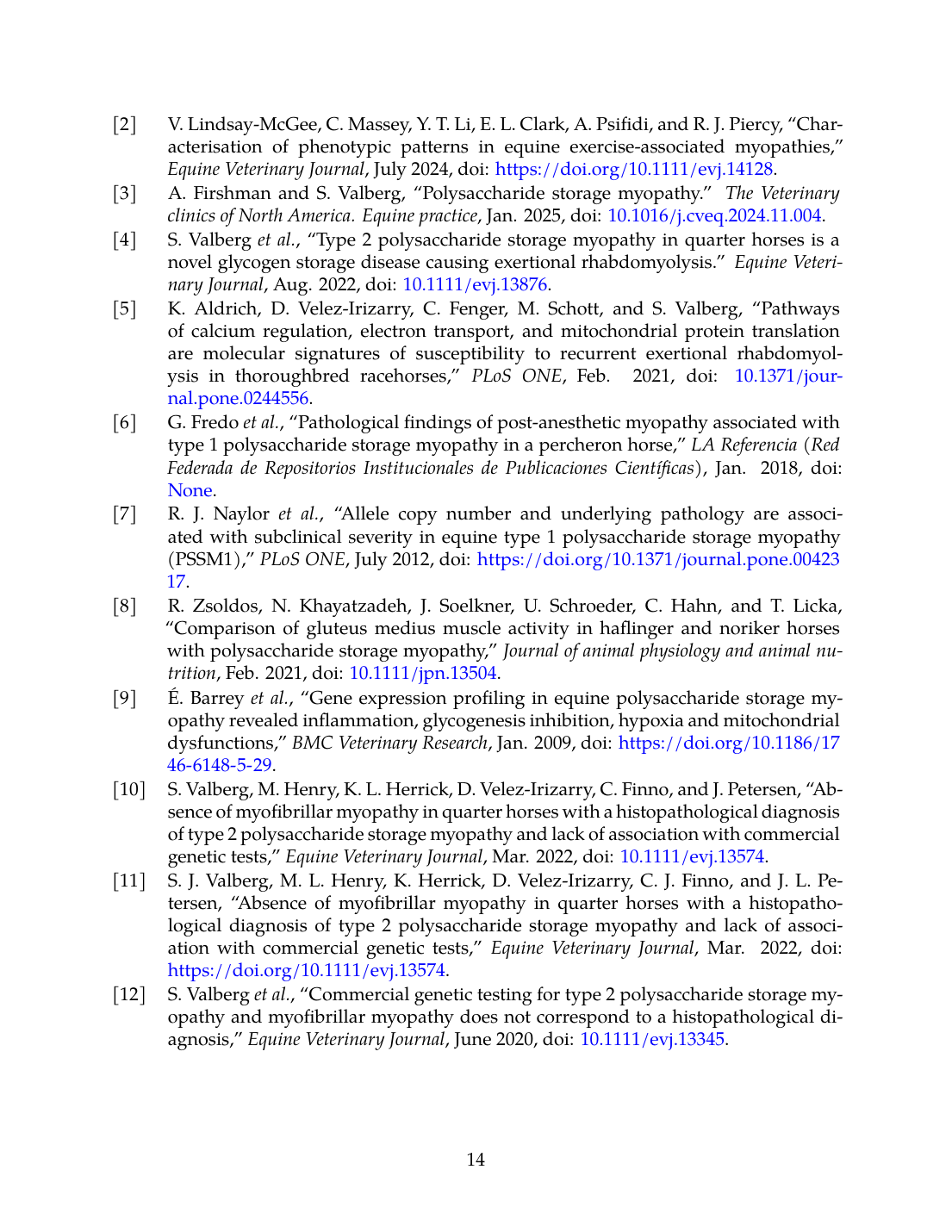 11. S. J. Valberg, M. L. Henry, K. Herrick, D. Velez‐Irizarry, C. J. Finno, and J. L. Petersen, “Absence of myofibrillar myopathy in Quarter Horses with a histopathological diagnosis of type 2 polysaccharide storage myopathy and lack of association with commercial genetic tests,” Equine Veterinary Journal, Mar. 2022. doi: 10.1111/evj.13574. View source