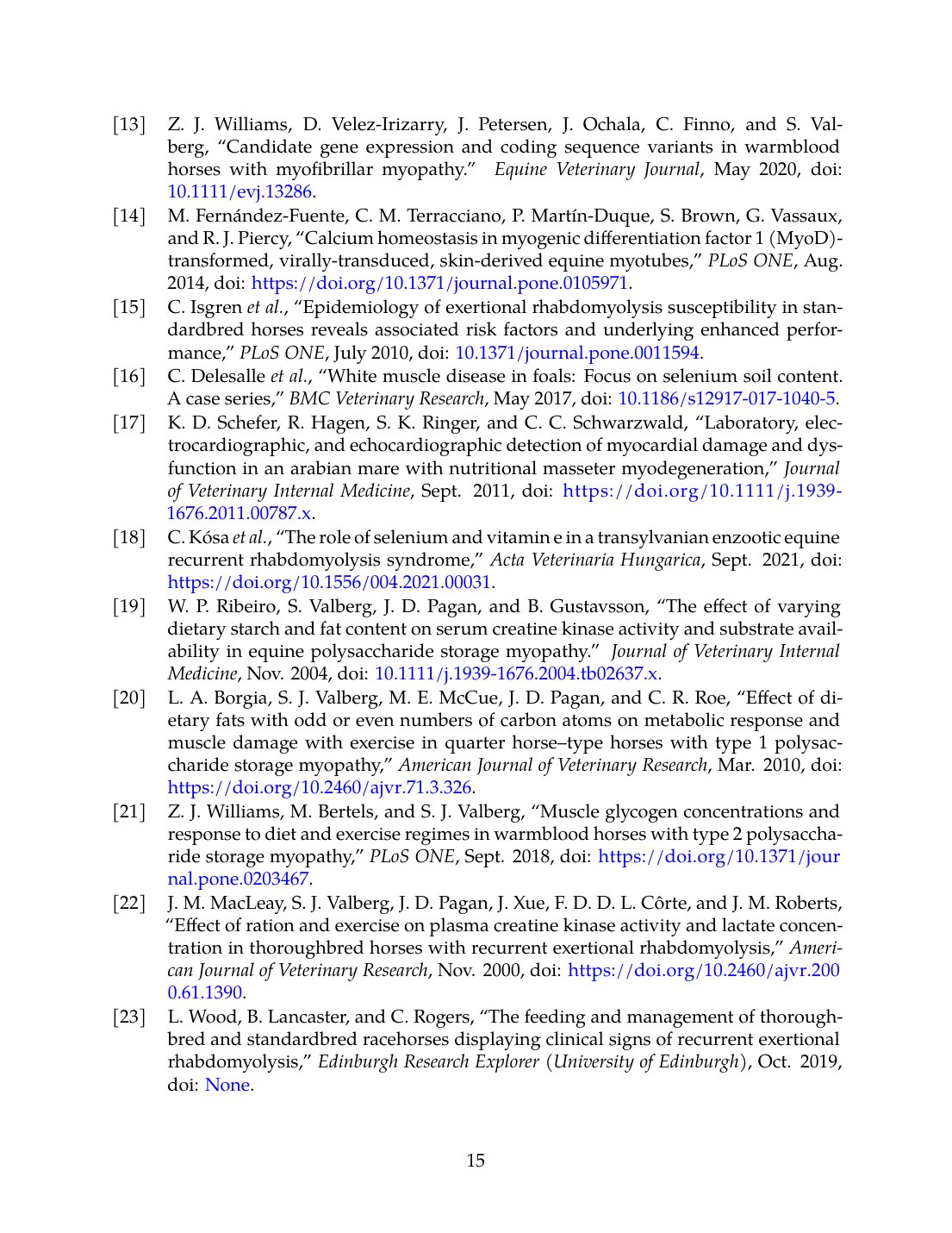 21. Z. J. Williams, M. Bertels, and S. J. Valberg, “Muscle glycogen concentrations and response to diet and exercise regimes in Warmblood horses with type 2 Polysaccharide Storage Myopathy,” PLoS ONE, Sep. 2018. doi: 10.1371/journal.pone.0203467. View source