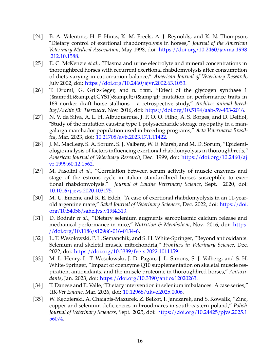 35. W. Kędzierski, A. Chałabis‐Mazurek, Z. Bełkot, I. Janczarek, and S. Kowalik, “Zinc, copper and selenium deficiencies in broodmares in south-eastern Poland,” Polish Journal of Veterinary Sciences, Sep. 2025. doi: 10.24425/pjvs.2025.156074. View source