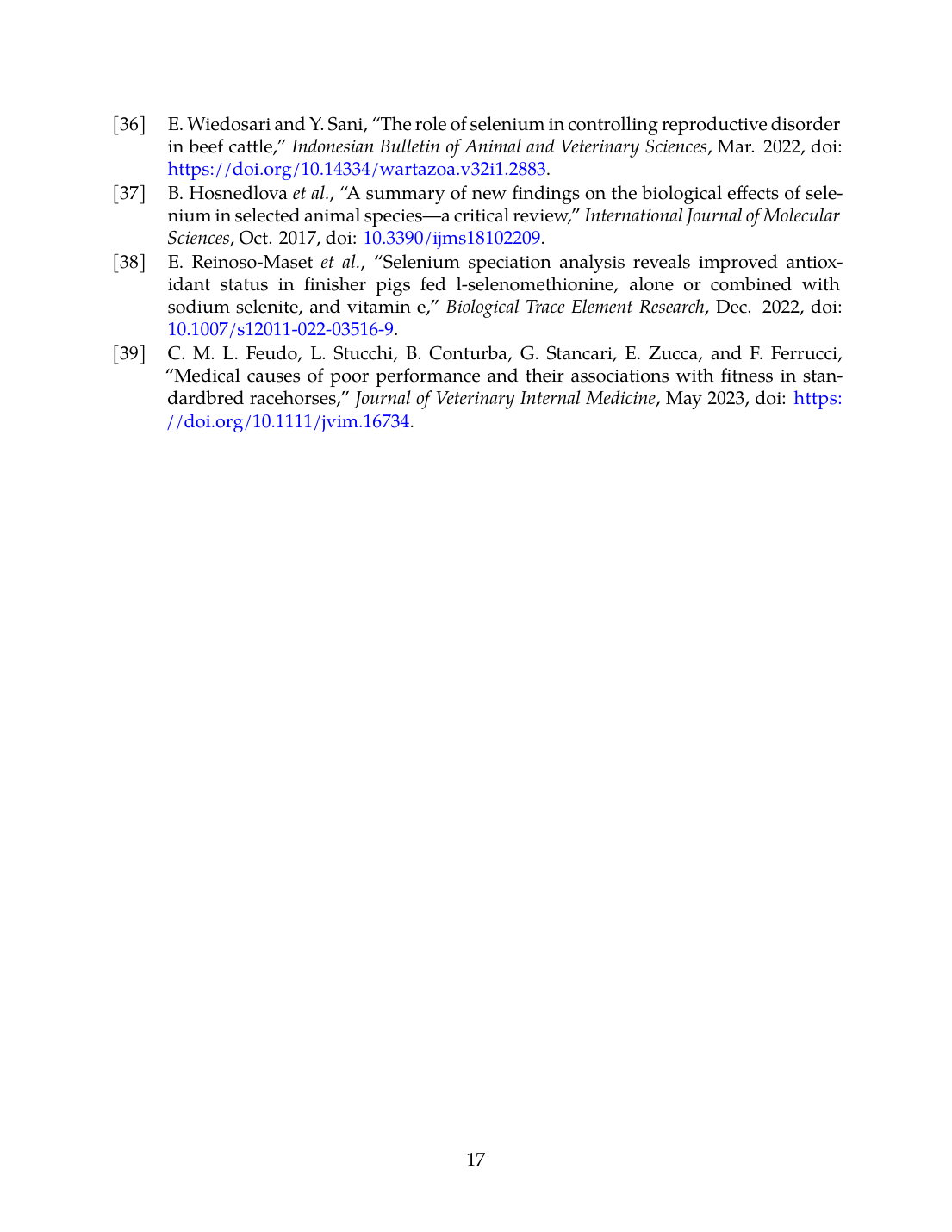37. B. Hosnedlova, M. Kepinska, S. Skalickova, C. Fernandez, B. Ruttkay-Nedecky, T. Malevu, J. Sochor, M. Baroň, M. Melčová, J. Žídková, and R. Kizek, “A Summary of New Findings on the Biological Effects of Selenium in Selected Animal Species—A Critical Review,” International Journal of Molecular Sciences, Oct. 2017. doi: 10.3390/ijms18102209. View source