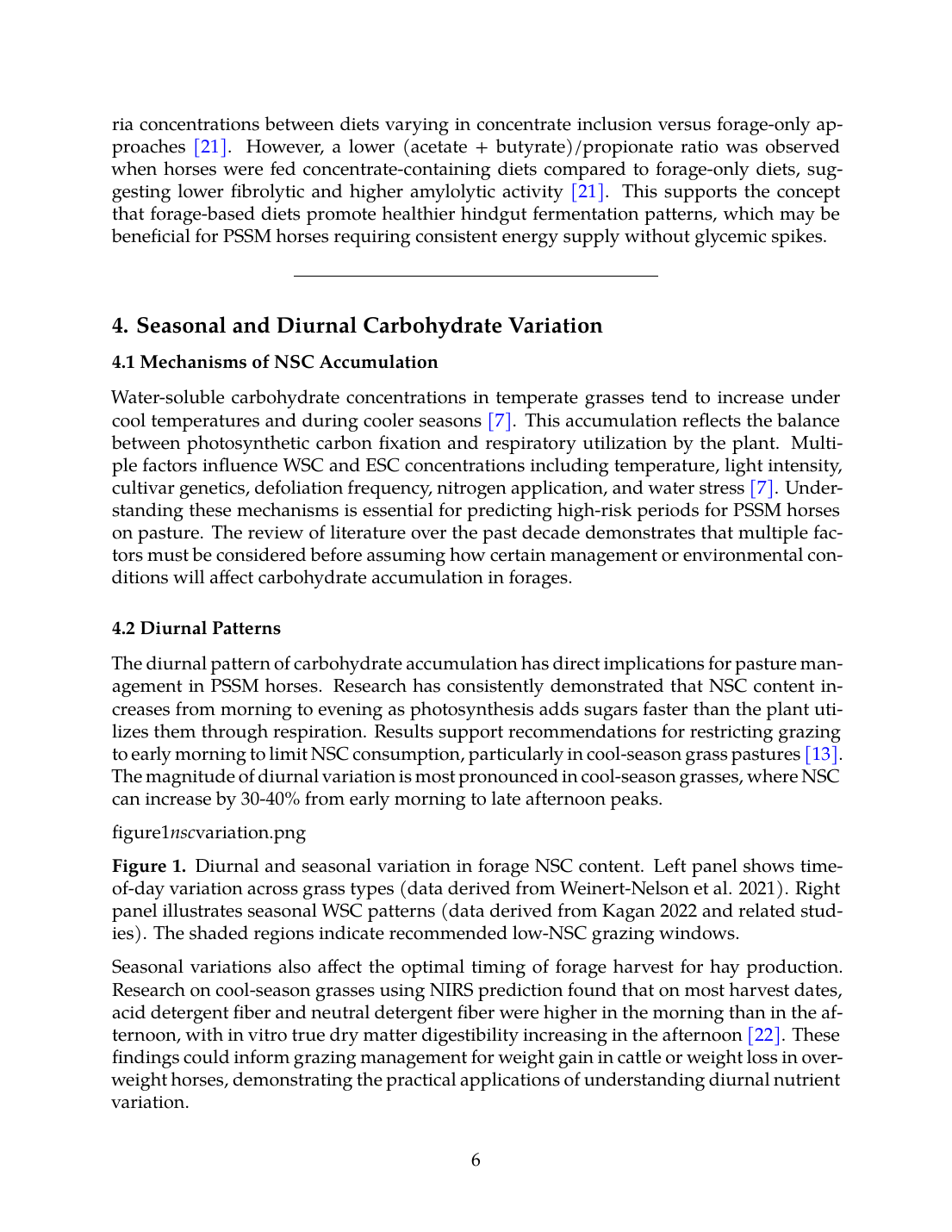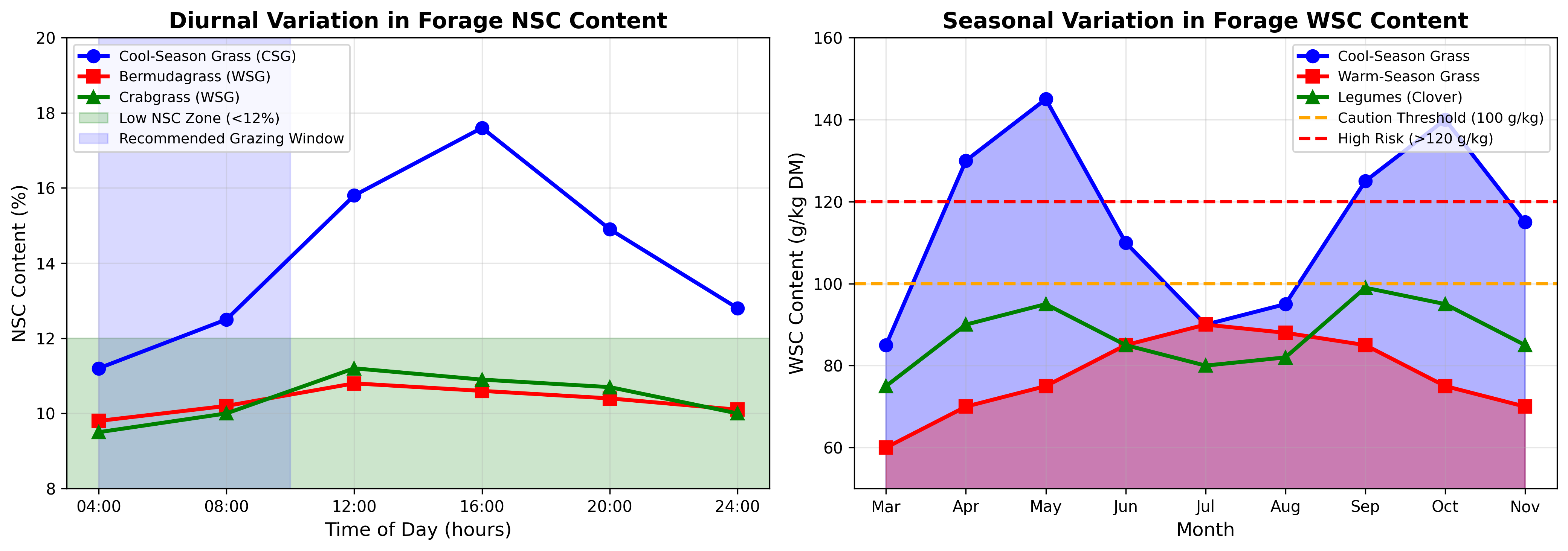 Figure 1. Diurnal and seasonal variation in forage NSC content. Left panel shows time-of-day variation across grass types (data derived from Weinert-Nelson et al. 2021). Right panel illustrates seasonal WSC patterns (data derived from Kagan 2022 and related studies). The shaded regions indicate recommended low-NSC grazing windows.
