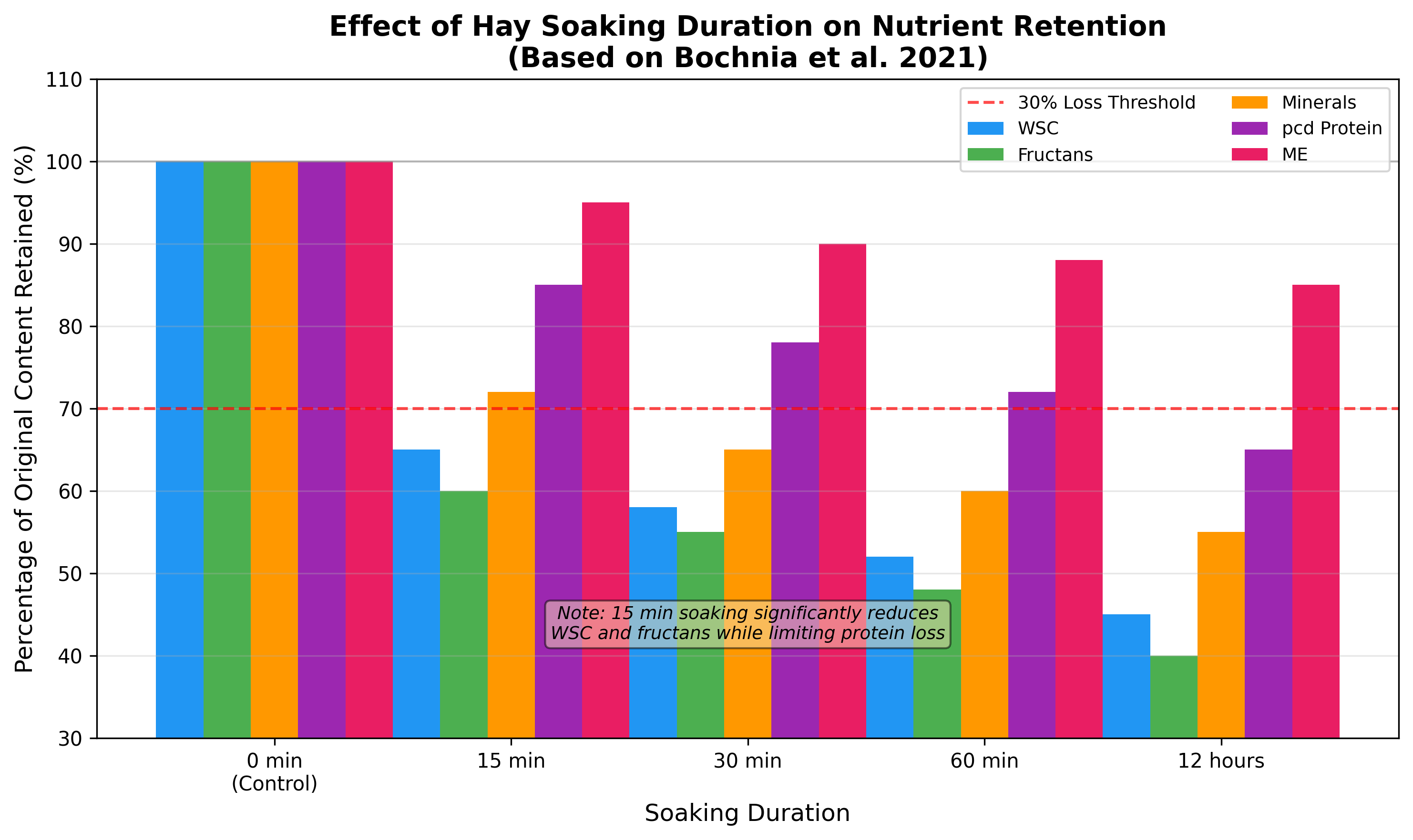 Figure 2. Effect of hay soaking duration on nutrient retention (data derived from Bochnia et al. 2021). Values represent percentage of original content retained after soaking at 20°C. Note that 15 minutes of soaking achieves substantial WSC and fructan reduction while limiting protein losses compared to prolonged soaking.