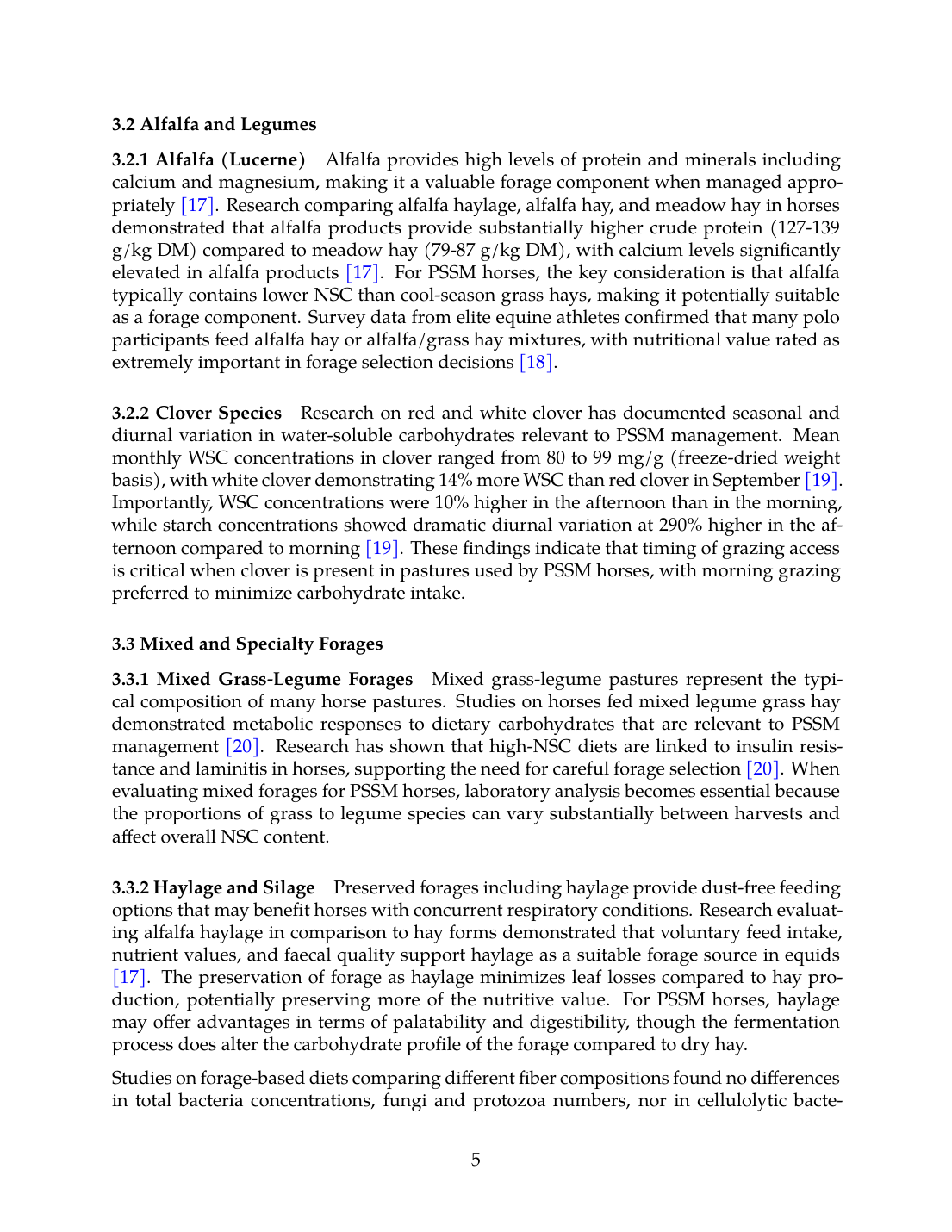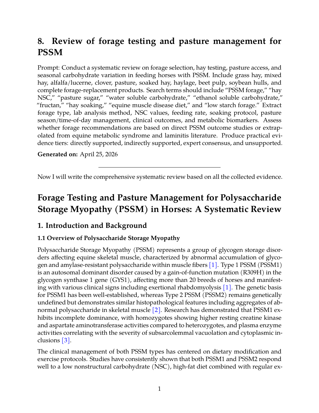This systematic review examines the evidence base for forage selection, hay testing protocols, pasture access management, and seasonal carbohydrate variation in feeding horses with PSSM. The review encompasses grass hay, mixed hay, alfalfa/lucerne, clover, pasture grasses, soaked hay, haylage, and fiber-based supplements including beet pulp and soybean hulls. Evidence is stratified into practical tiers: directly supported by PSSM outcome studies, indirectly supported by related metabolic condition research, expert consensus recommendations, and unsupported claims.