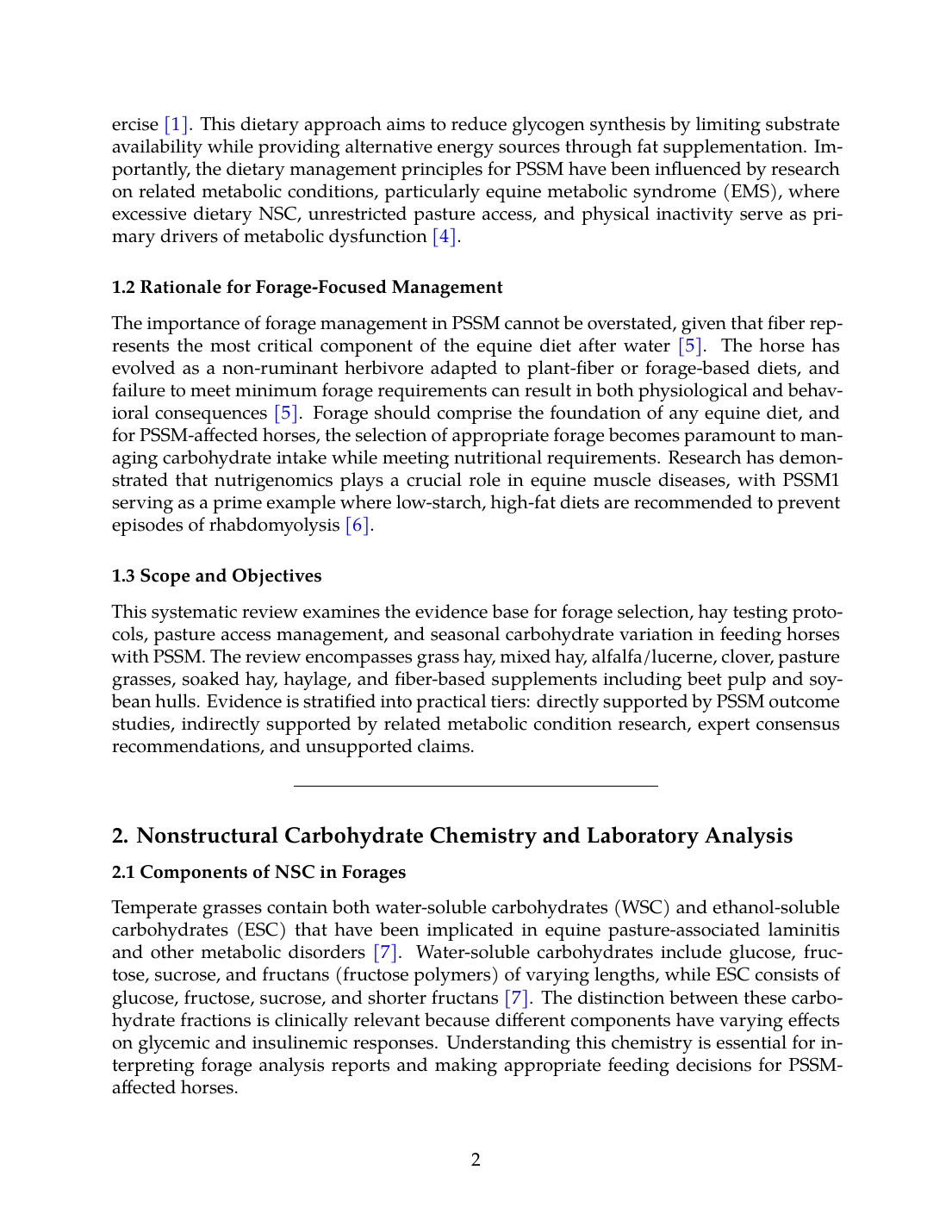 This systematic review argues that PSSM forage management is a year-round biology problem, not a seasonal precaution, not only because diurnal and seasonal NSC swings in pasture grass routinely exceed the safe ceiling for affected horses, but also because hay storage, grass species, harvest stage, and field fertilization each change the NSC profile in ways that defeat single-test reassurance; by synthesizing the agronomic, equine nutrition, and clinical literature on hay quality, rotational grazing, grazing muzzles, dry-lot management, and pasture-restriction protocols across temperate and warm-season grass systems, this review builds a season-stratified forage management protocol and identifies where current heuristics oversimplify the underlying biology.