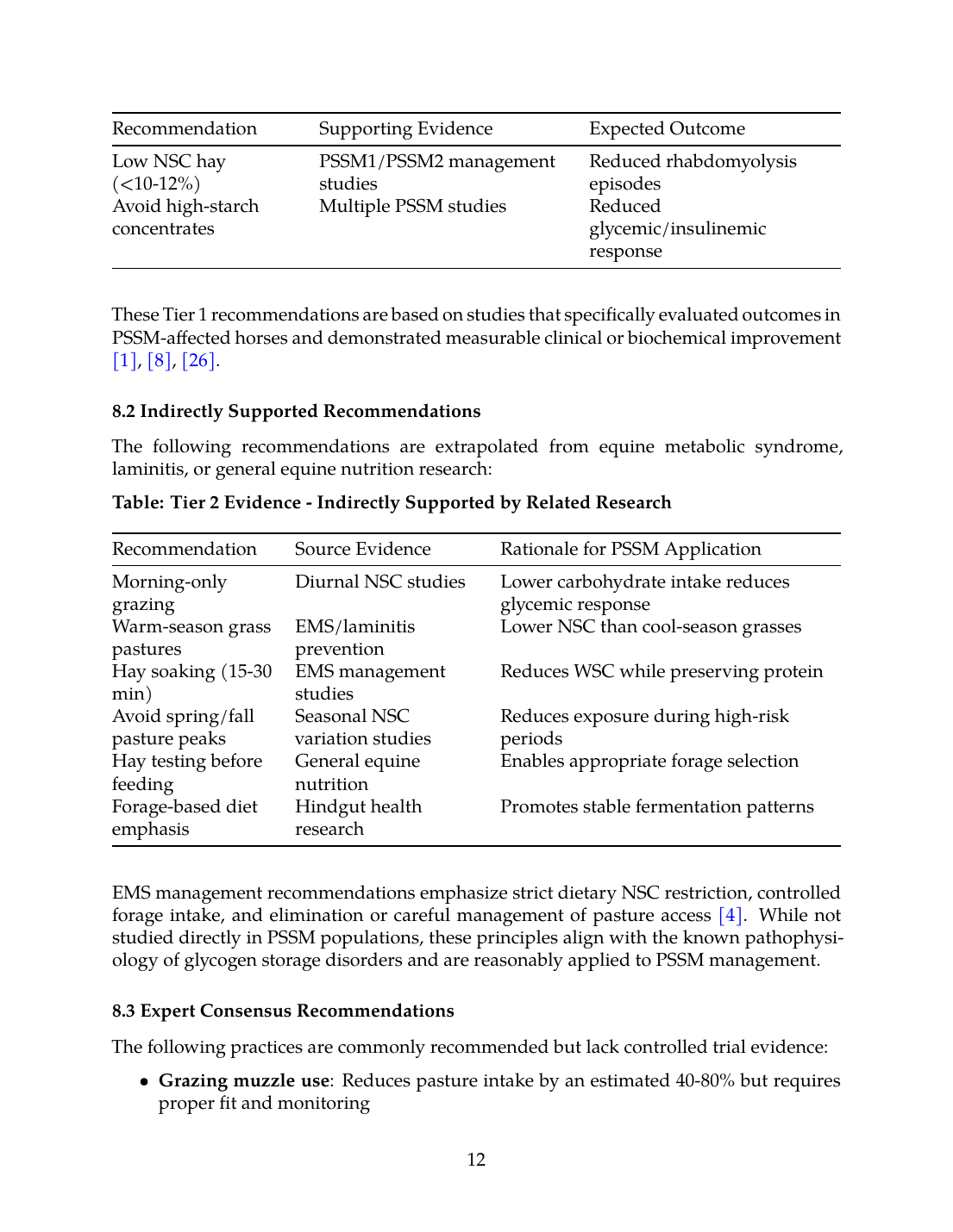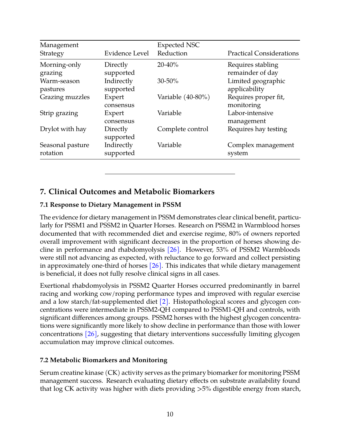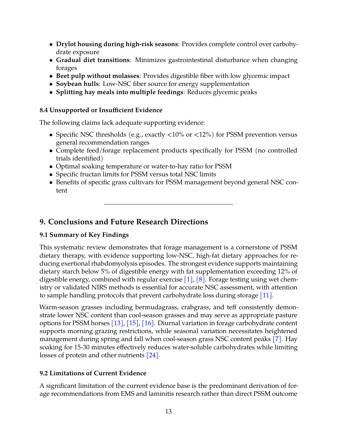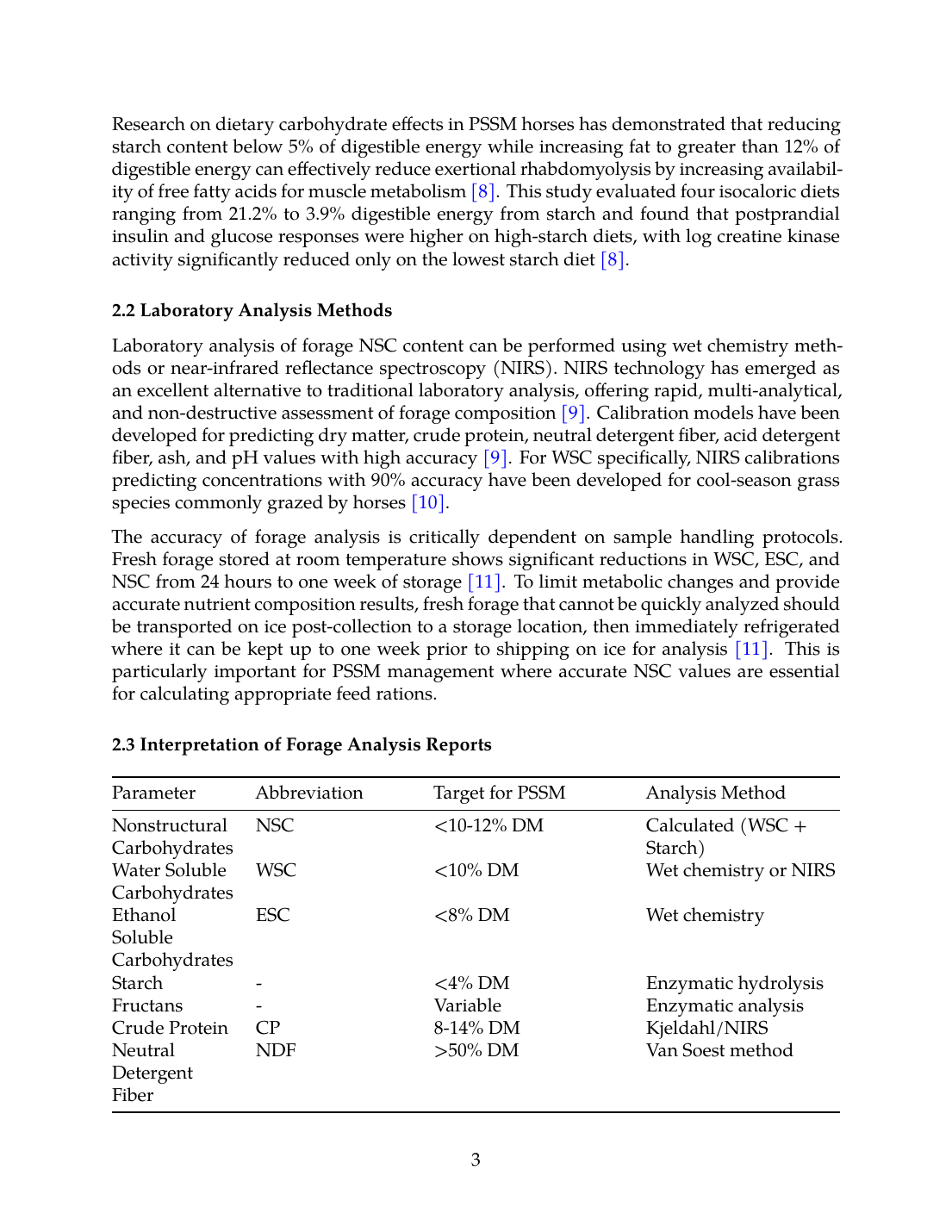 This systematic review demonstrates that forage management is a cornerstone of PSSM dietary therapy, with evidence supporting low-NSC, high-fat dietary approaches for reducing exertional rhabdomyolysis episodes. The strongest evidence supports maintaining dietary starch below 5% of digestible energy with fat supplementation exceeding 12% of digestible energy, combined with regular exercise [8],[1]. Forage testing using wet chemistry or validated NIRS methods is essential for accurate NSC assessment, with attention to sample handling protocols that prevent carbohydrate loss during storage [11].