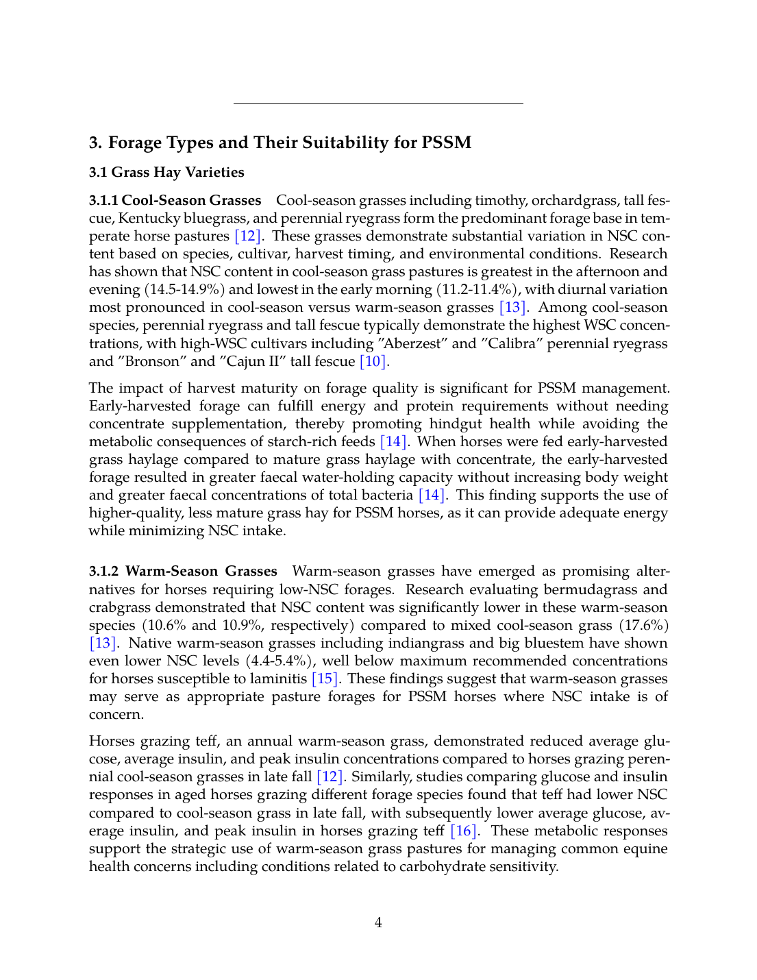 Warm-season grasses have emerged as promising alternatives for horses requiring low-NSC forages. Research evaluating bermudagrass and crabgrass demonstrated that NSC content was significantly lower in these warm-season species (10.6% and 10.9%, respectively) compared to mixed cool-season grass (17.6%) [13]. Native warm-season grasses including indiangrass and big bluestem have shown even lower NSC levels (4.4-5.4%), well below maximum recommended concentrations for horses susceptible to laminitis [15]. These findings suggest that warm-season grasses may serve as appropriate pasture forages for PSSM horses where NSC intake is of concern.