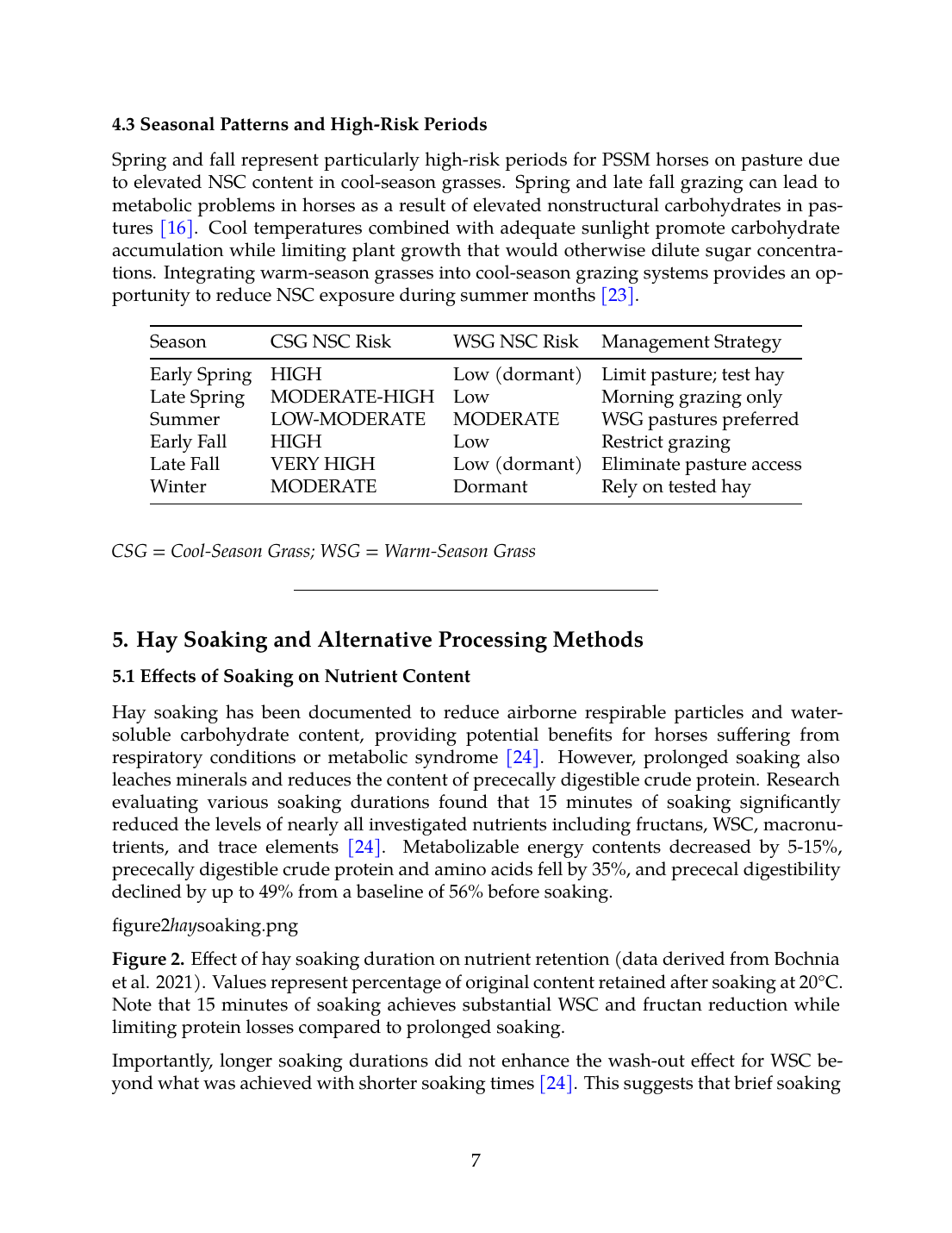 Warm-season grasses including bermudagrass, crabgrass, and teff consistently demonstrate lower NSC content than cool-season grasses and may serve as appropriate pasture options for PSSM horses [13],[15],[16]. Diurnal variation in forage carbohydrate content supports morning grazing restrictions, while seasonal variation necessitates heightened management during spring and fall when cool-season grass NSC content peaks [7]. Hay soaking for 15-30 minutes effectively reduces water-soluble carbohydrates while limiting losses of protein and other nutrients [24].