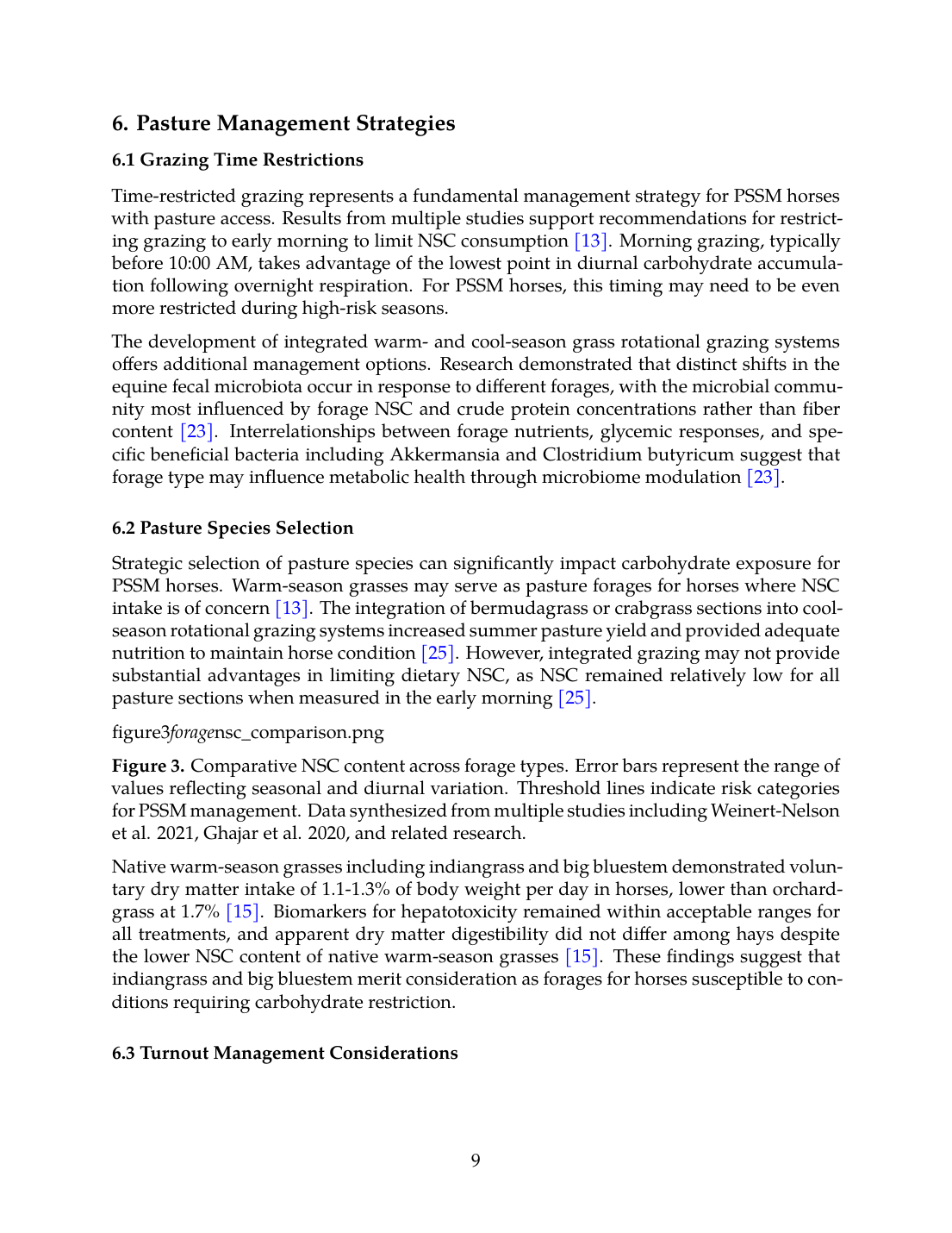 Figure 3. Comparative NSC content across forage types. Error bars represent the range of values reflecting seasonal and diurnal variation. Threshold lines indicate risk categories for PSSM management. Data synthesized from multiple studies including Weinert-Nelson et al. 2021, Ghajar et al. 2020, and related research.