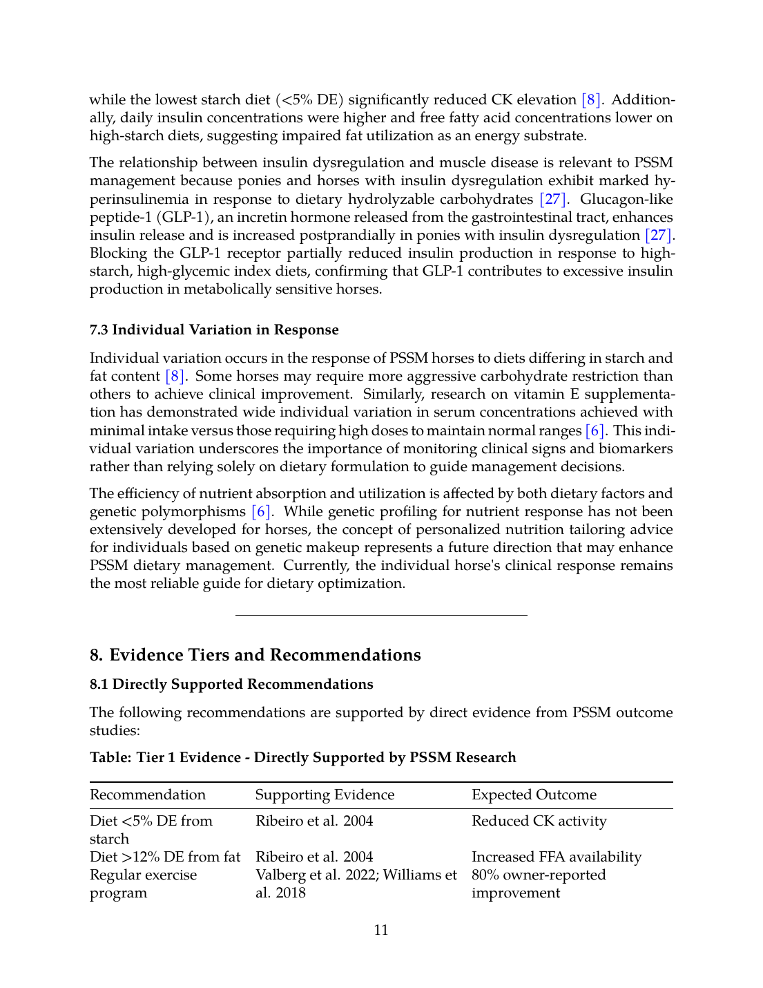 Individual variation occurs in the response of PSSM horses to diets differing in starch and fat content [8]. Some horses may require more aggressive carbohydrate restriction than others to achieve clinical improvement. Similarly, research on vitamin E supplementation has demonstrated wide individual variation in serum concentrations achieved with minimal intake versus those requiring high doses to maintain normal ranges [6]. This individual variation underscores the importance of monitoring clinical signs and biomarkers rather than relying solely on dietary formulation to guide management decisions.