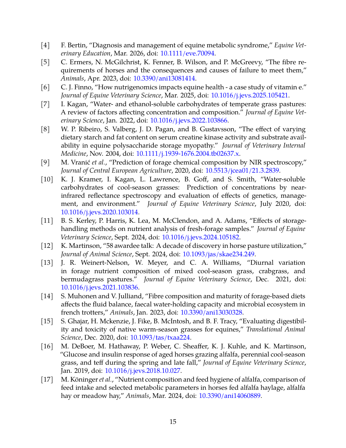- M. DeBoer, M. Hathaway, P. Weber, C. Sheaffer, K. J. Kuhle, and K. Martinson, “Glucose and Insulin Response of Aged Horses Grazing Alfalfa, Perennial Cool‐Season Grass, and Teff During the Spring and Late Fall,” Journal of Equine Veterinary Science, Jan. 2019. doi: 10.1016/j.jevs.2018.10.027. View source