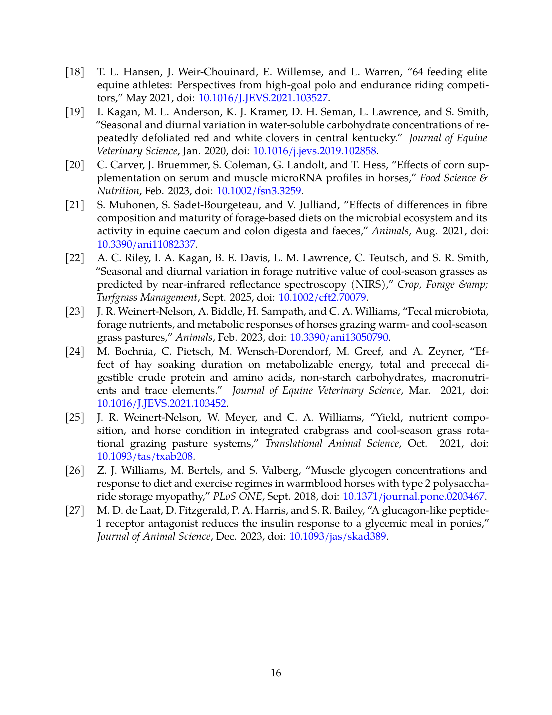 - J. R. Weinert-Nelson, W. Meyer, and C. A. Williams, “Diurnal Variation in Forage Nutrient Composition of Mixed Cool-Season Grass, Crabgrass, and Bermudagrass Pastures.,” Journal of Equine Veterinary Science, Dec. 2021. doi: 10.1016/j.jevs.2021.103836. View source