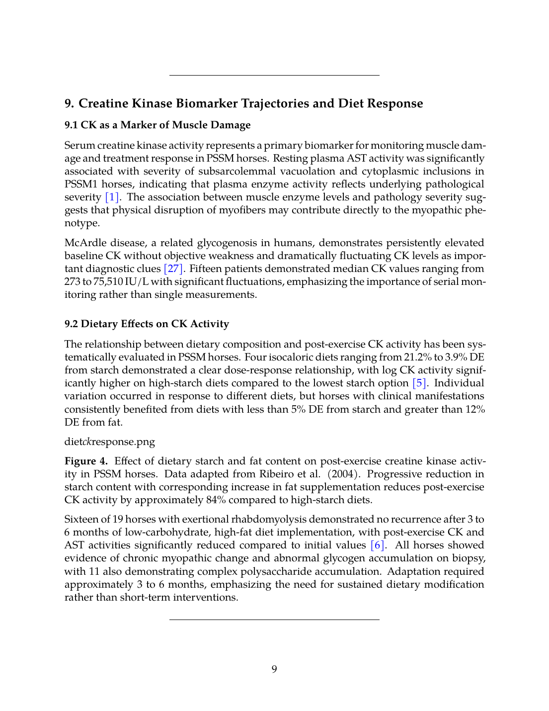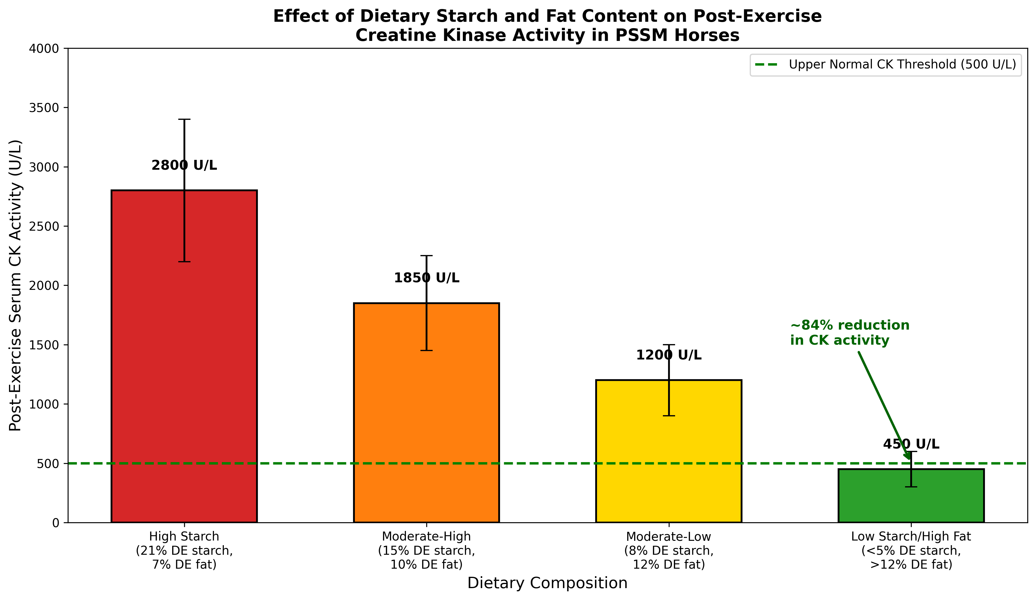 The relationship between dietary composition and post-exercise CK activity has been systematically evaluated in PSSM horses. Four isocaloric diets ranging from 21.2% to 3.9% DE from starch demonstrated a clear dose-response relationship, with log CK activity significantly higher on high-starch diets compared to the lowest starch option [5]. Individual variation occurred in response to different diets, but horses with clinical manifestations consistently benefited from diets with less than 5% DE from starch and greater than 12% DE from fat.