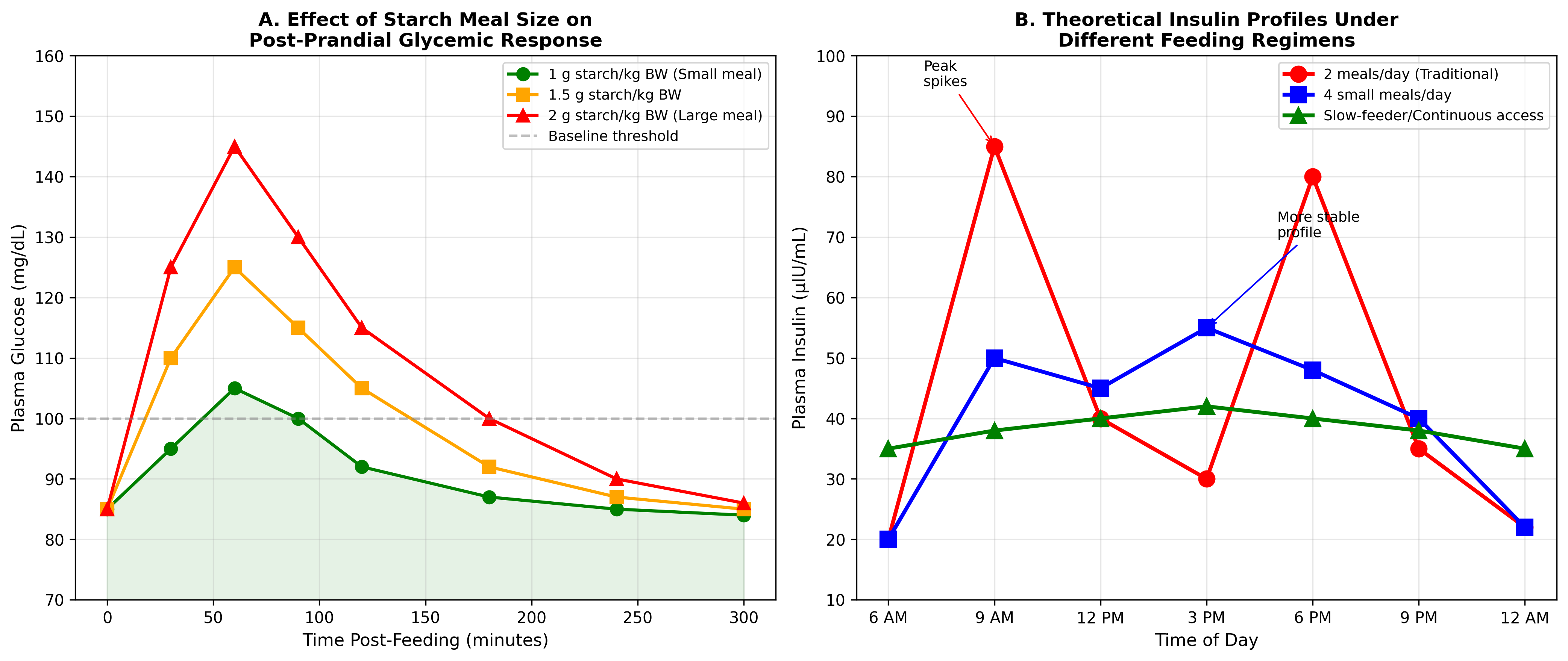 Figure 1. Effect of starch meal size on post-prandial glycemic response (Panel A) and theoretical insulin profiles under different feeding regimens (Panel B). Data adapted from Varasteh et al. (2023). Smaller, more frequent meals produce lower peak glucose concentrations and more stable insulin profiles compared to traditional two-meal regimens.