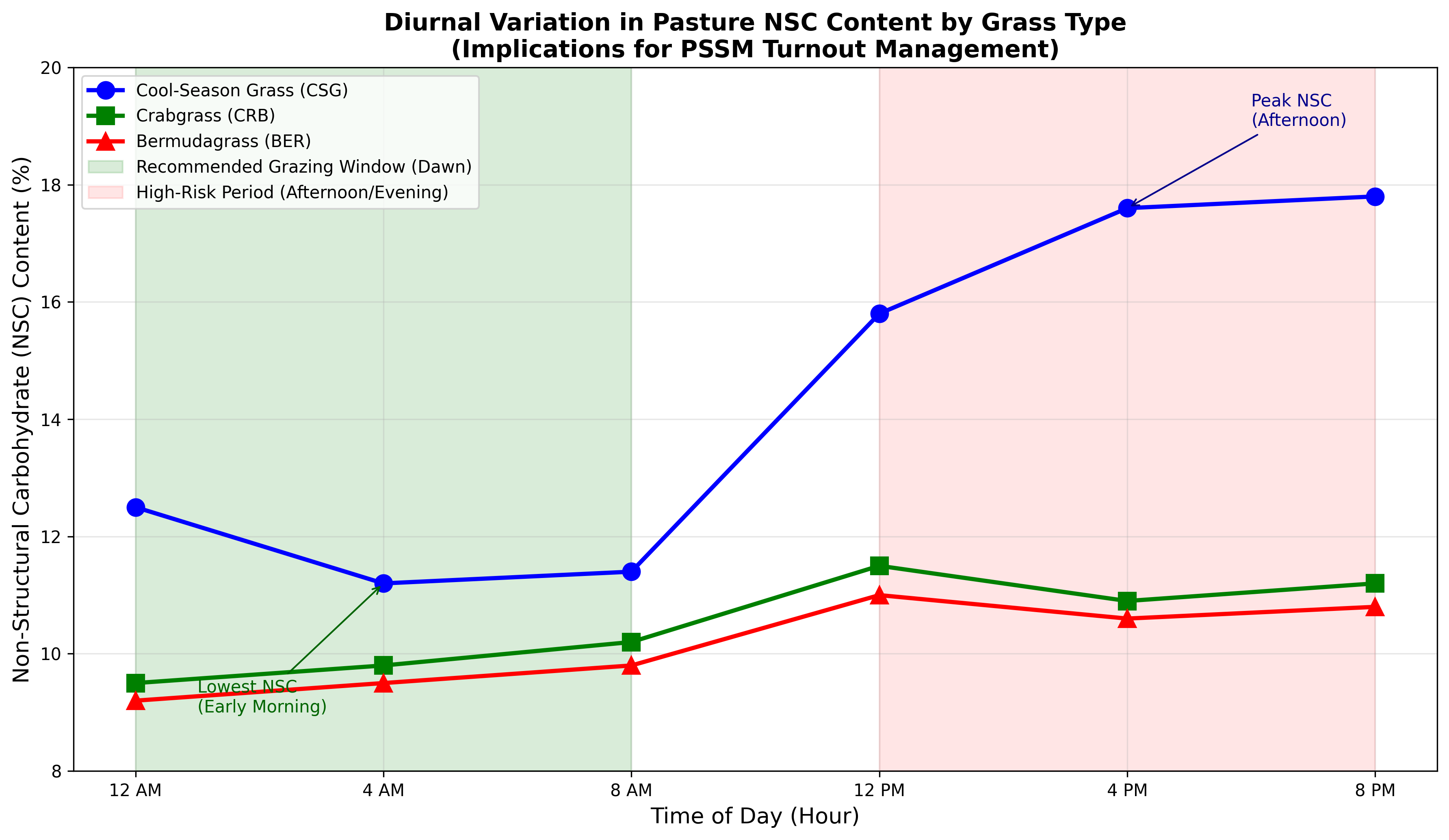 Pasture NSC content demonstrates significant diurnal variation that directly impacts PSSM management decisions. Research evaluating cool-season grasses (CSG), crabgrass (CRB), and bermudagrass (BER) demonstrated that NSC was greatest in the afternoon and evening (14.5-14.9%) and lowest in the early morning (11.2-11.4%) [16]. Critically, diurnal variation was most pronounced in cool-season grasses versus either warm-season alternative. Cool-season grasses demonstrated significantly higher NSC (17.6%) compared to bermudagrass (10.6%) or crabgrass (10.9%), supporting recommendations to consider warm-season grasses for metabolically compromised horses.