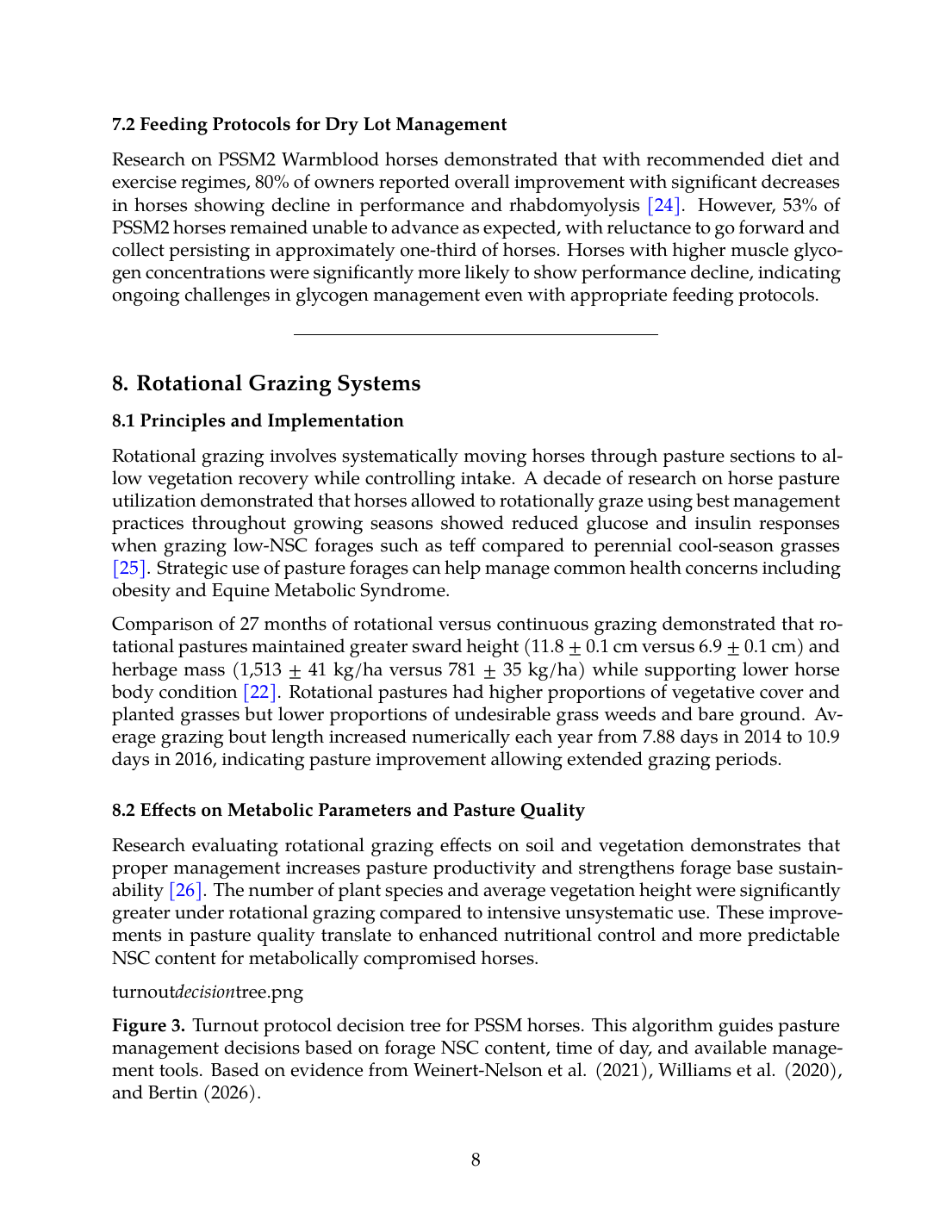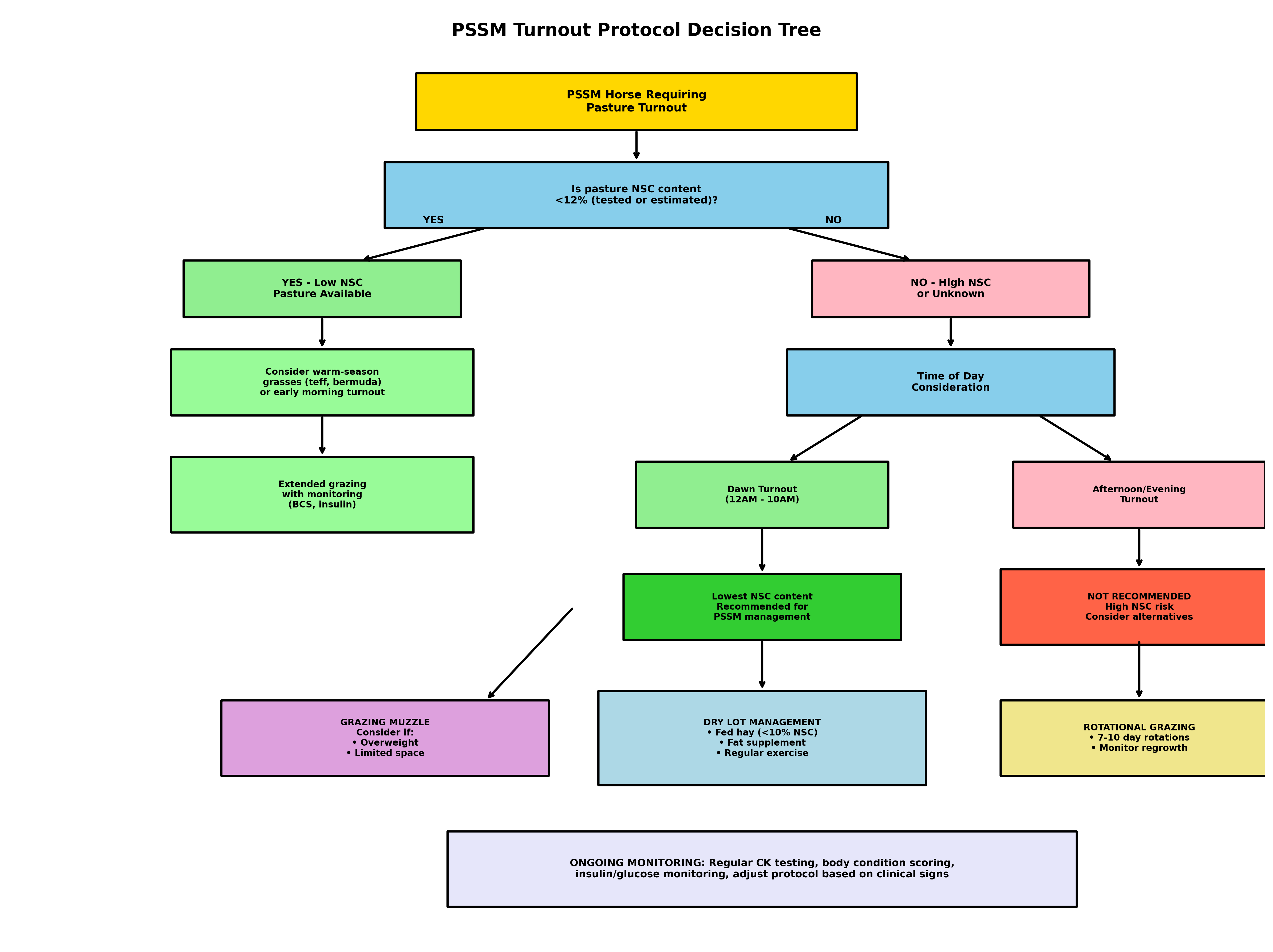 Figure 3. Turnout protocol decision tree for PSSM horses. This algorithm guides pasture management decisions based on forage NSC content, time of day, and available management tools. Based on evidence from Weinert-Nelson et al. (2021), Williams et al. (2020), and Bertin (2026).