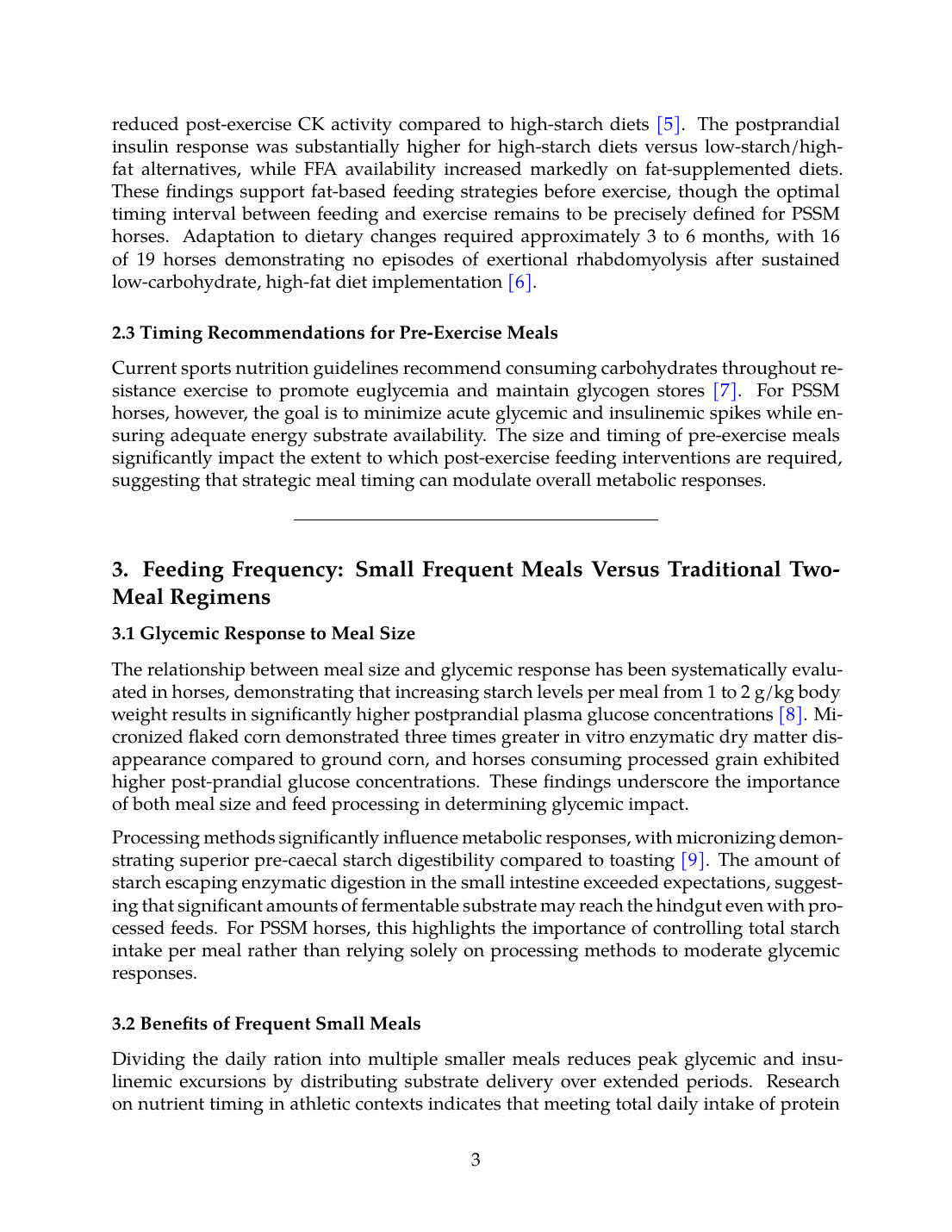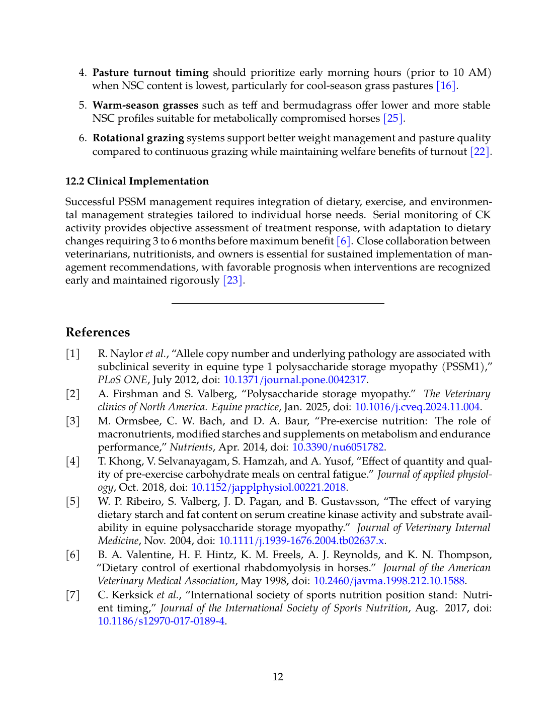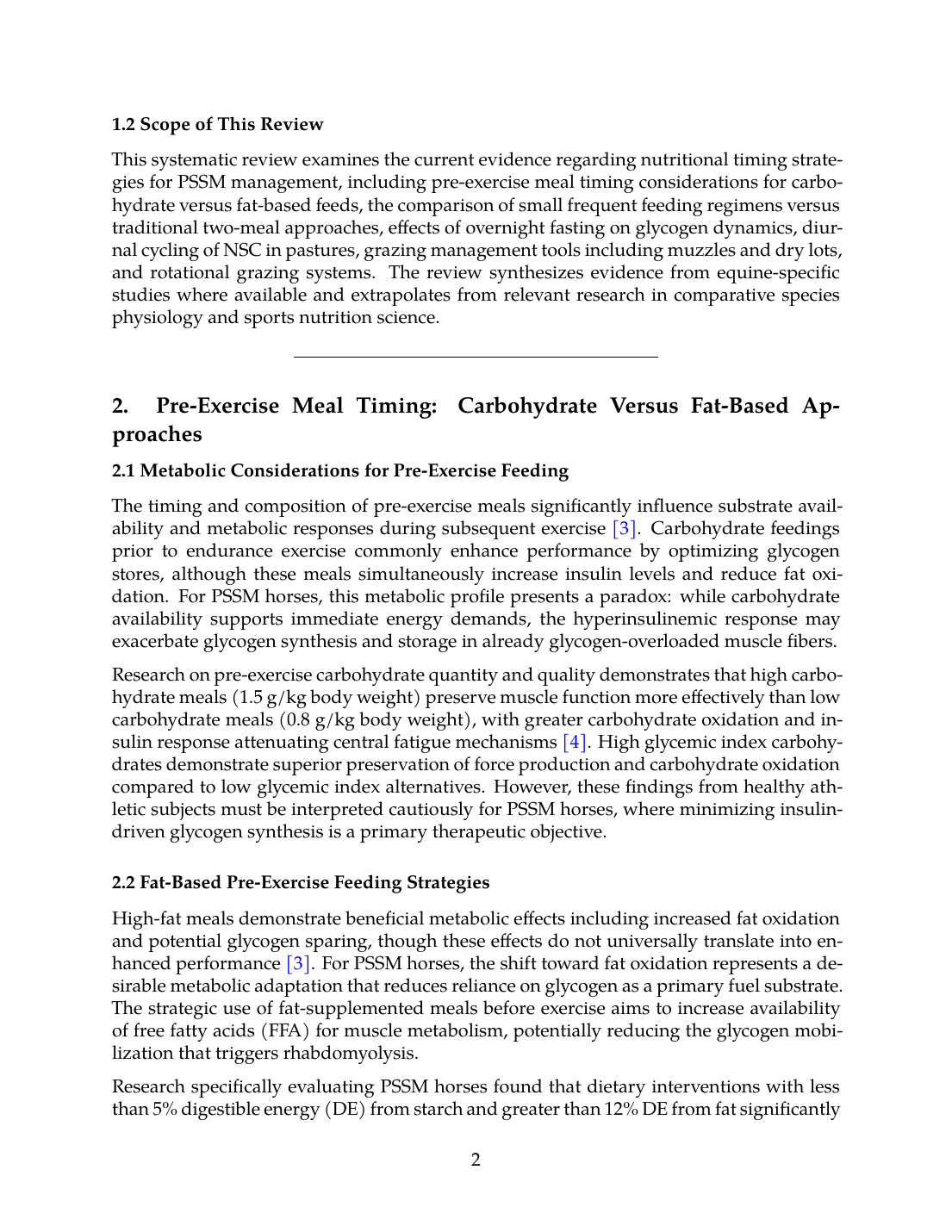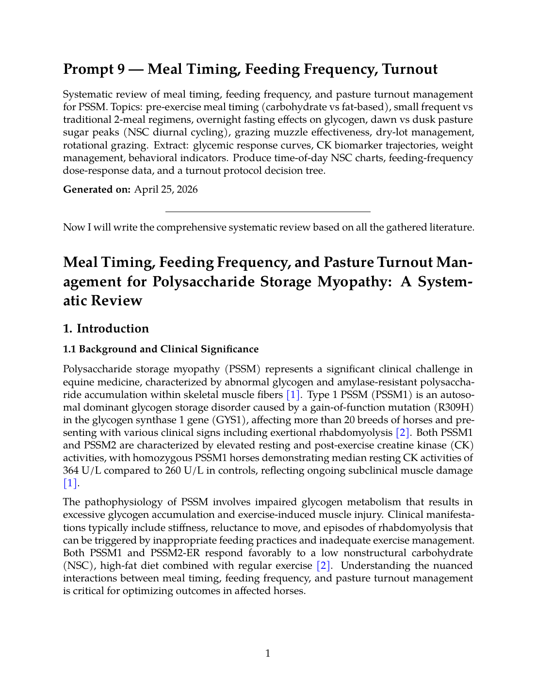 This systematic review examines the current evidence regarding nutritional timing strategies for PSSM management, including pre-exercise meal timing considerations for carbohydrate versus fat-based feeds, the comparison of small frequent feeding regimens versus traditional two-meal approaches, effects of overnight fasting on glycogen dynamics, diurnal cycling of NSC in pastures, grazing management tools including muzzles and dry lots, and rotational grazing systems. The review synthesizes evidence from equine-specific studies where available and extrapolates from relevant research in comparative species physiology and sports nutrition science.