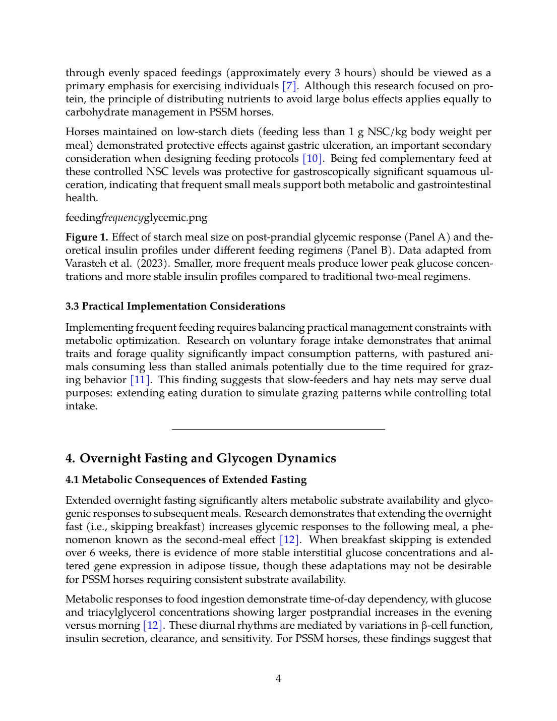 - Feeding frequency should favor multiple small meals delivering less than 1 g NSC/kg body weight per meal to maintain stable glycemic profiles and reduce peak insulin excursions [8].