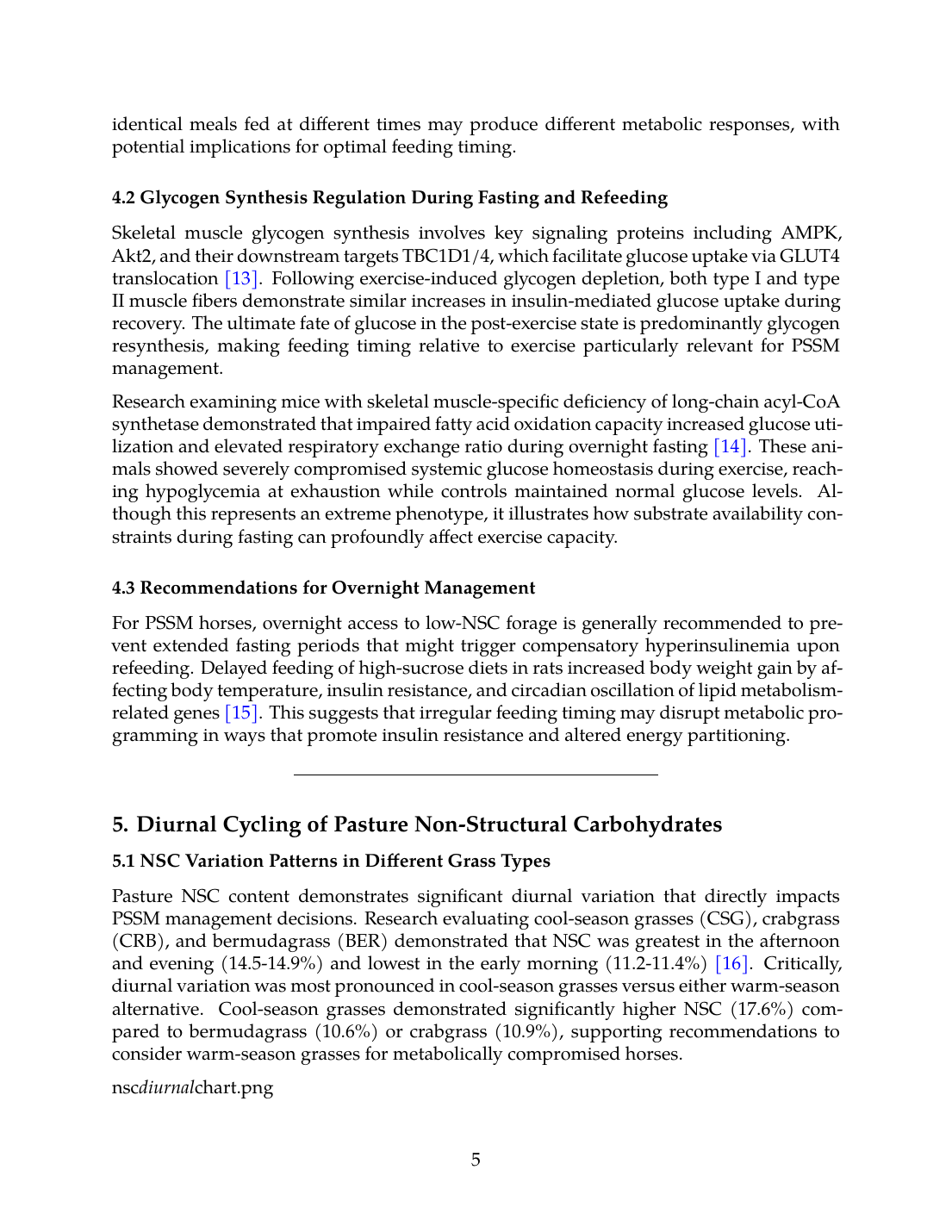 This systematic review argues that meal timing, feeding frequency, and pasture-access scheduling are an undervalued lever in PSSM management, comparable in clinical effect to NSC restriction itself, not only because diurnal NSC variation in pasture grass and post-prandial glucose curves drive measurable swings in muscle glycogen flux, but also because feeding interval and pre-exercise meal composition shift insulin response in horses already biased toward excess glycogen storage; by examining grazing-pattern, glycemic-response, and feeding-frequency trials across PSSM1 and suspected PSSM2 populations, this review establishes meal-timing and turnout protocols supported by clinical-outcome data, not just by glucose-curve studies.