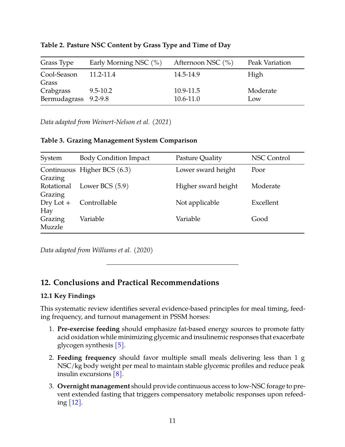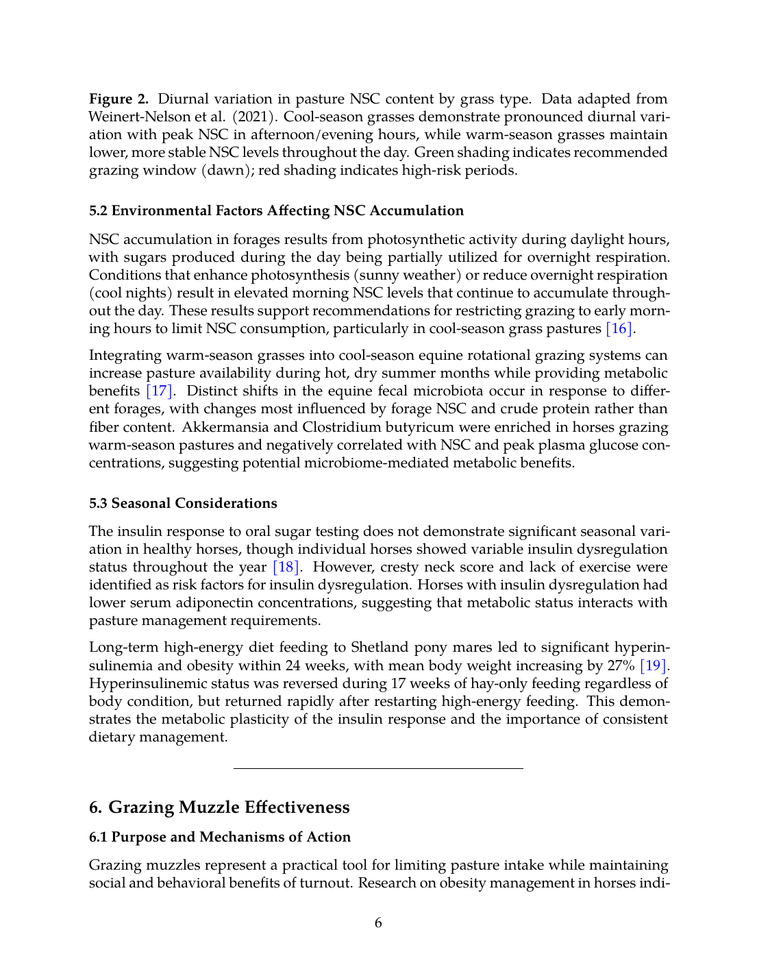 - Pasture turnout timing should prioritize early morning hours (prior to 10 AM) when NSC content is lowest, particularly for cool-season grass pastures [16].