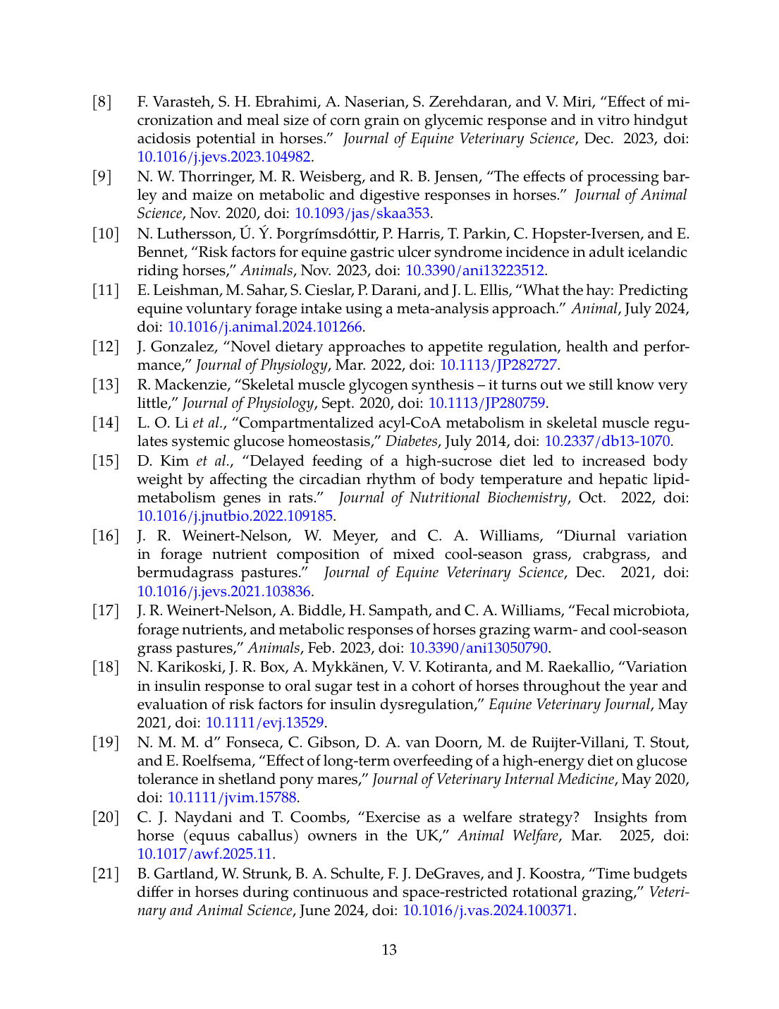 - E. Leishman, M. Sahar, S. Cieslar, P. Darani, and J. L. Ellis, “What the hay: predicting equine voluntary forage intake using a meta-analysis approach.,” Animal, Jul. 2024. doi: 10.1016/j.animal.2024.101266. View source