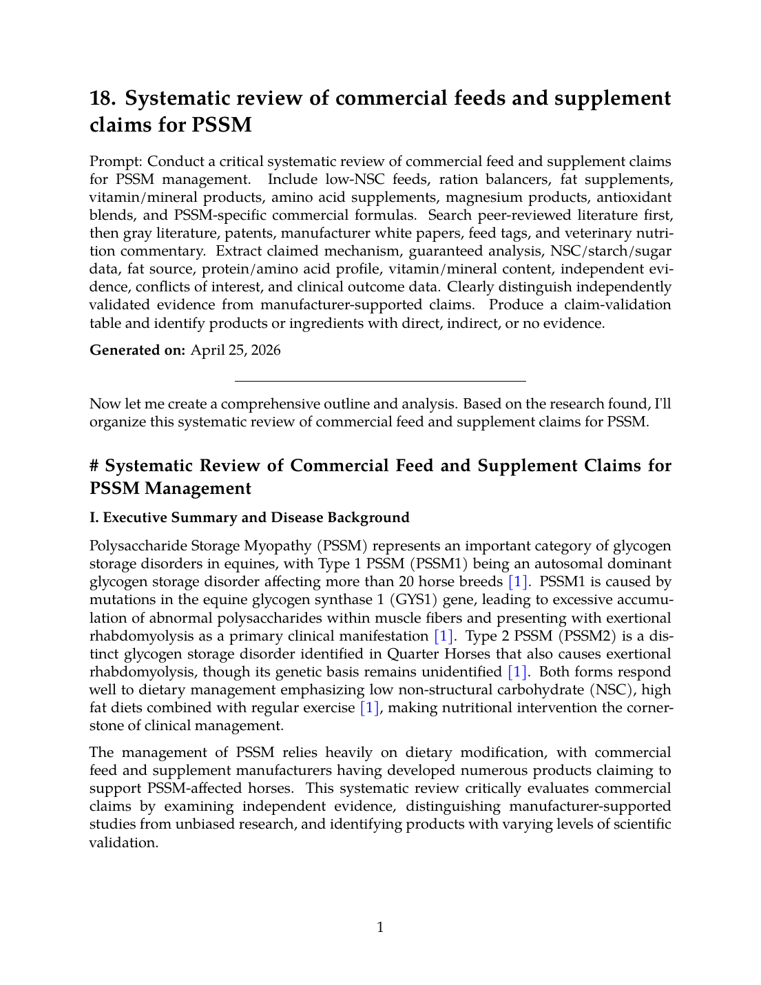 Now let me create a comprehensive outline and analysis. Based on the research found, I'll organize this systematic review of commercial feed and supplement claims for PSSM.